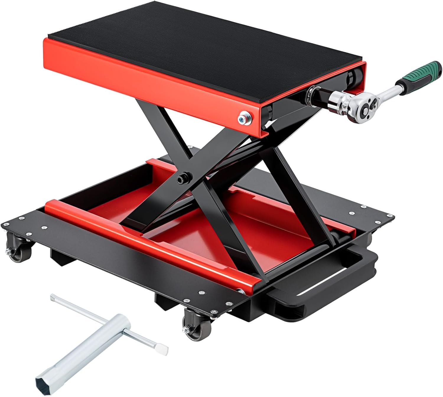 - Convenient Dolly with Handle : Our motorcycle jack comes with a dolly featuring an easy move handle and 4 sturdy iron casters. Effortlessly transport your motorcycle with ease and convenience