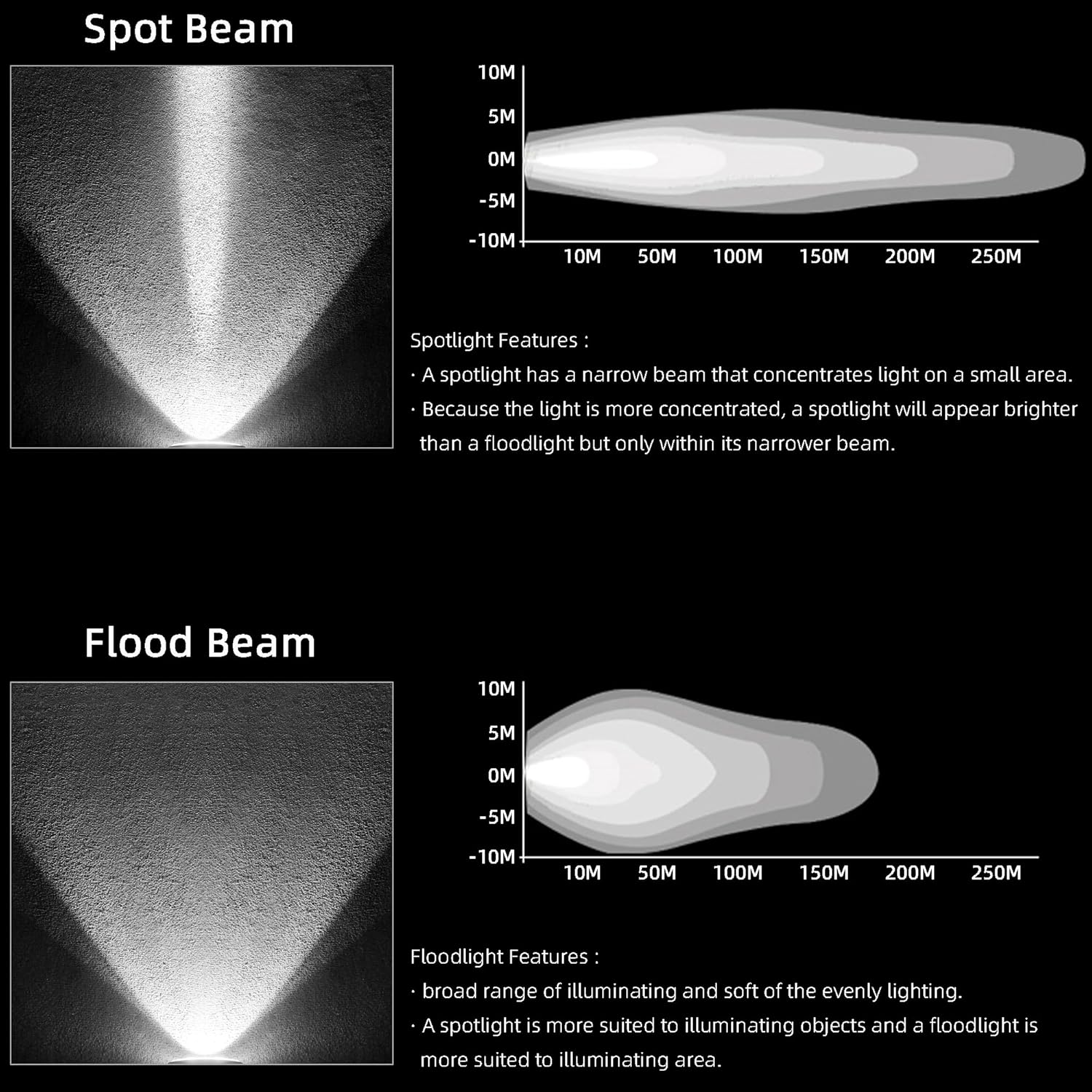 - 【FLOODLIGHT FEATURES】 Flood beam illuminates to broad viewing area, allowing you to see the left and right clearly.