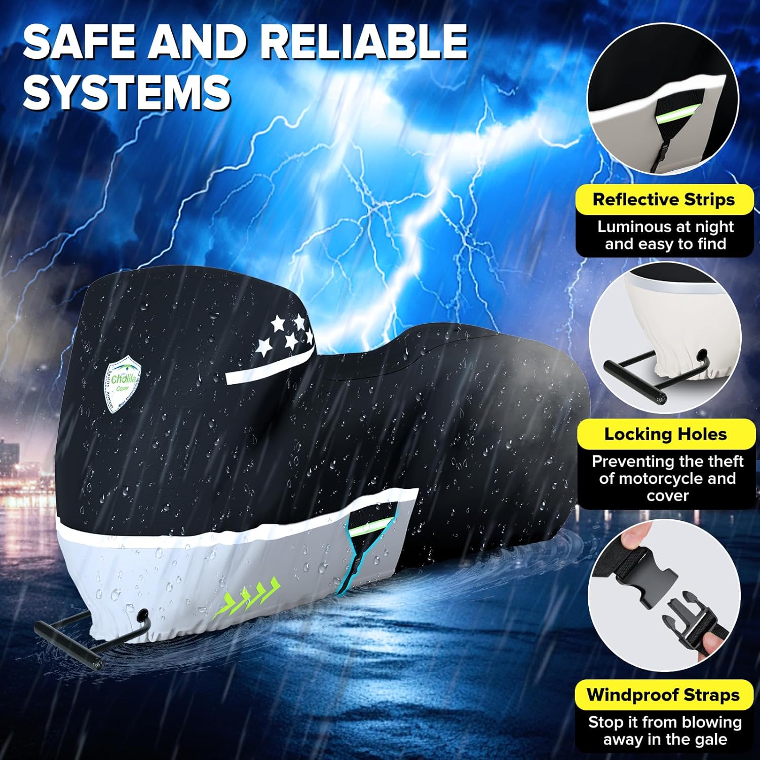 - Thoughtful Details: ①Thickened Adjustable Windproof Straps and Buckles - which can be adjusted to make the cover and the motorcycle fit better. ②Nylon thread seams rather than cotton thread - Cotton thread is easily broken by tension, while nylon thread is not easy to break. ③ABS Lock-hole - where you can place a lock to prevent theft
