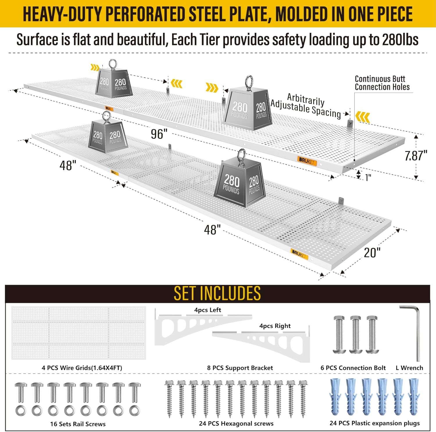 - KIT INCLUDES: Includes 4pcs of face plate; 8 Brackets; 24 Hexagonal screws (Hardened ∅0.2" L/2"); 24 plastic expansion plugs, 16 Sets of rail attachment bolts; 1 L-wrench; 1 installation manual. All the hardware of Brukid professional series wall mounted shelves are under strict quality control and testing, we strive to provide our customers with a quality shopping experience, when you receive the product encountered any problems, please contact us at the first time, we will certainly give you a satisfactory solution
