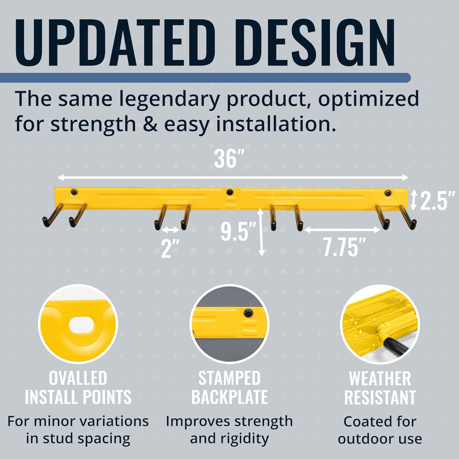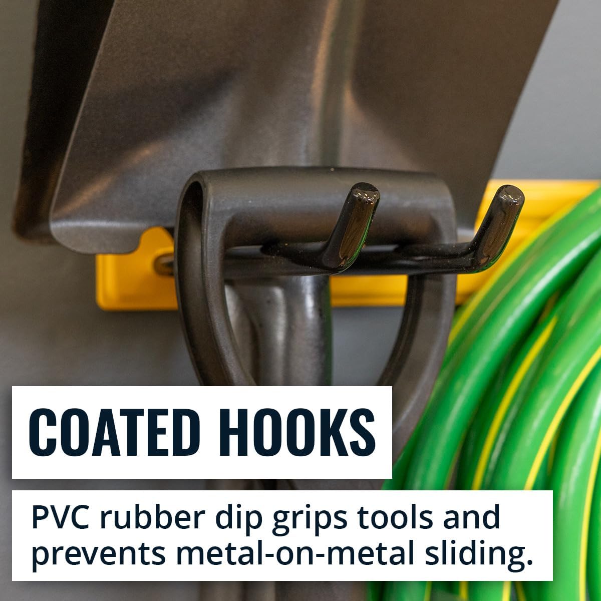 - RECLAIM YOUR GARAGE – Conquer clutter with this garden tool organizer designed for garage storage, sheds, or workshops. Measuring 36" L x 9.5" W x 2.5" H, it features four PVC-coated garage hooks and a 250 lb weight capacity, ideal for storing shovels, brooms, rakes, and power tools. Installs with 3 heavy-duty lag screws directly into 16" wall studs for secure, long-lasting support.