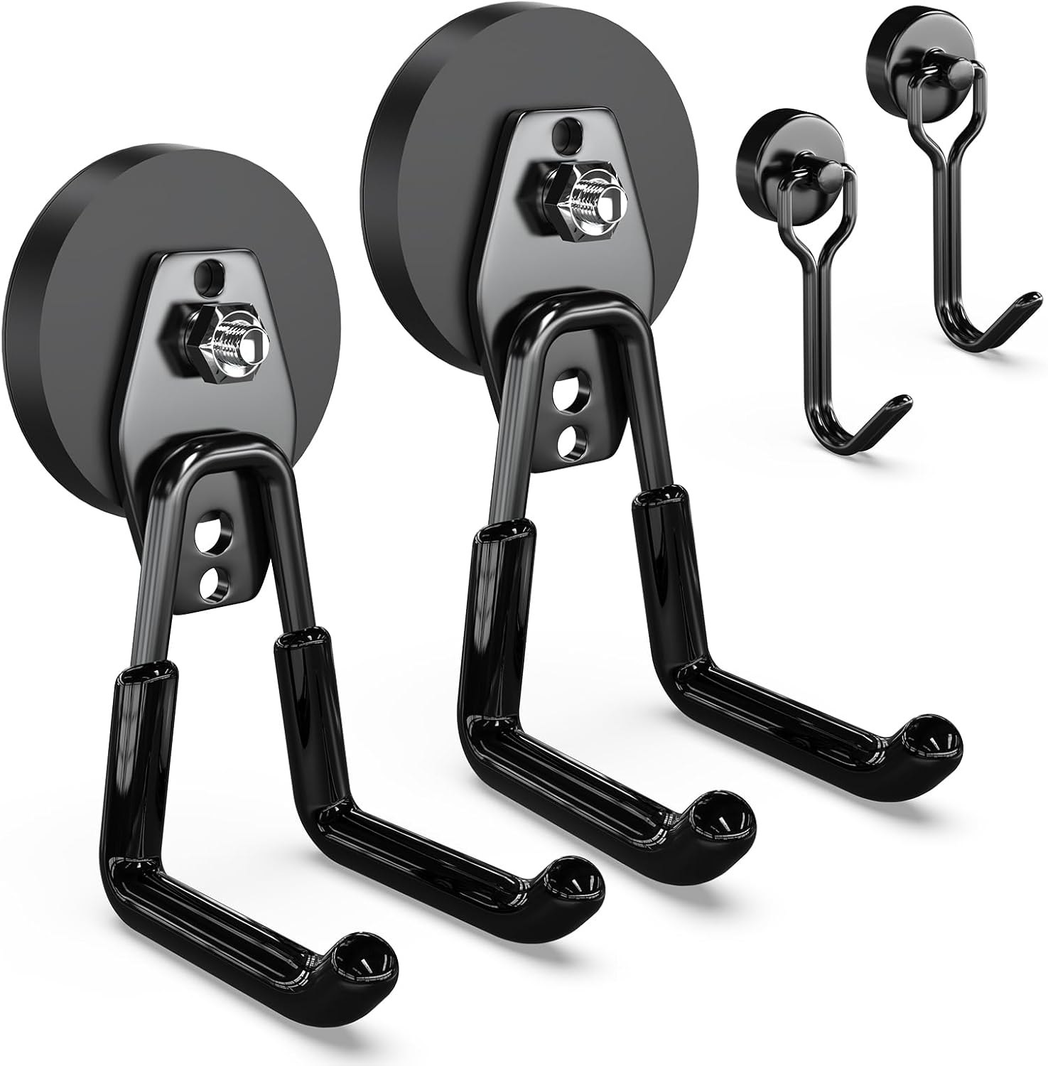- Innovation Design Magnetic Hooks: Save yourself the hassle of drilling holes, simply attach extra strong magnetic hooks on metal surface, you can move them around as your needs change. The large magnetic hook has a dual-hook design for versatile use and can be separated into magnet and hook components. Our magnets with garage hooks heavy duty are coated with non-slip PVC and has protective sleeves to prevent scratches and rust