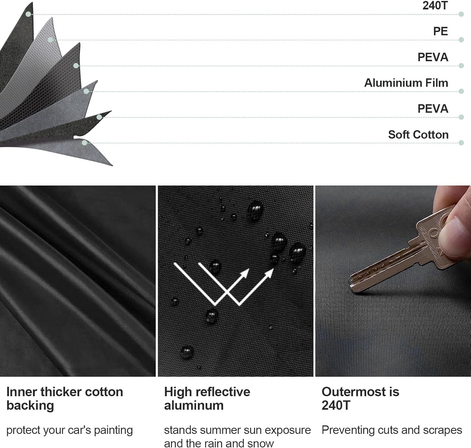 - 【6 Layers Superior Material】240T polyester taffeta fabric, Composite layer, black waterproof coating, soft lint layer.,Inner thicker cotton backing to protect your car's painting.Come With a Portable Storage Bag To Keep Your Cover.