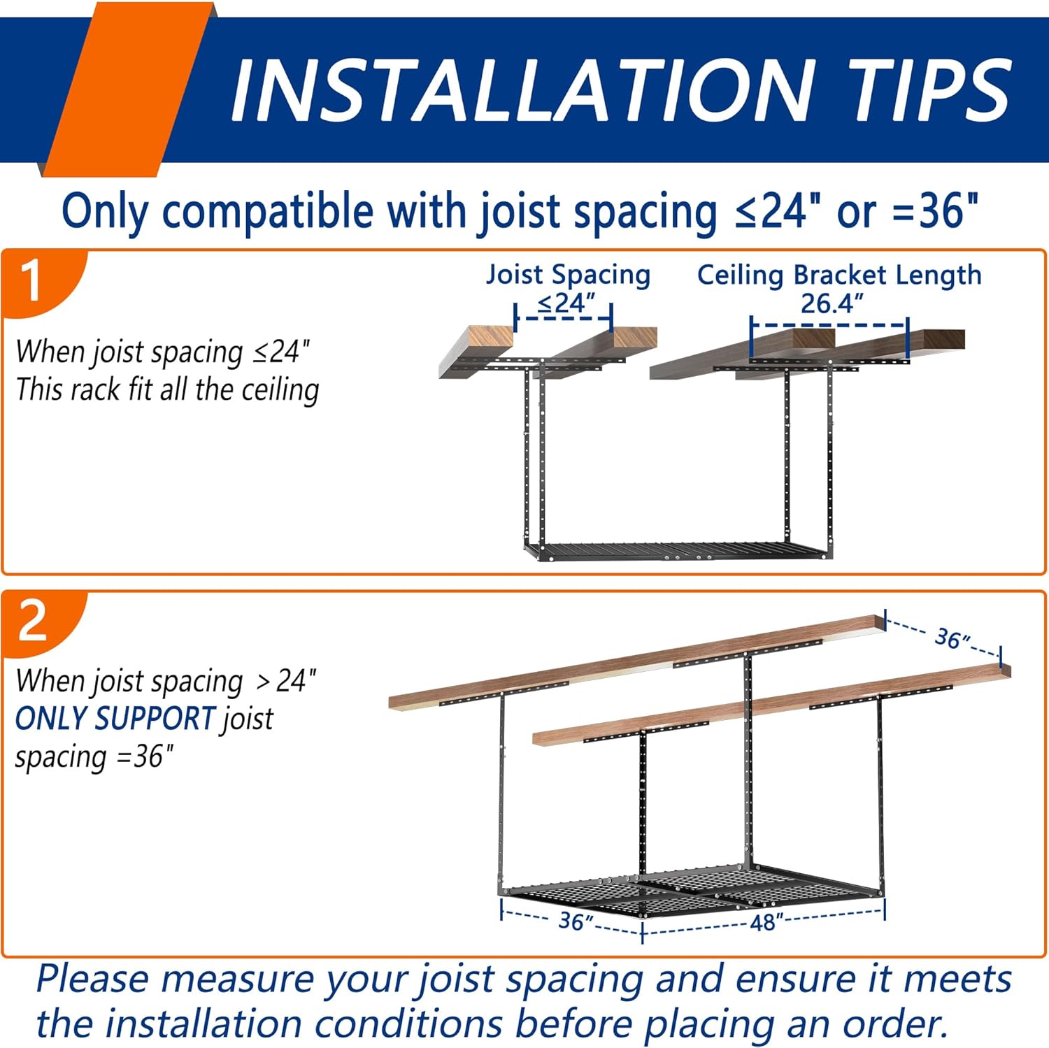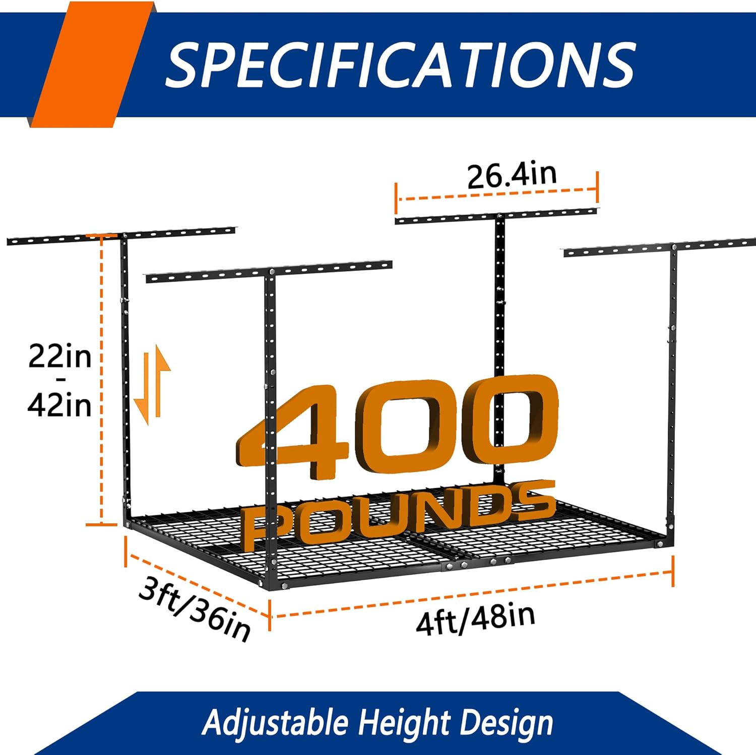 - ADJUSTABLE HEIGHT: Our garage storage racks are height adjustable,giving you the freedom to adjust the distance between the rack and the ceiling from 22 inches to 42 inches. This 3FT x 4FT ceiling mount rack adds up to 40 cubic feet of storage space.