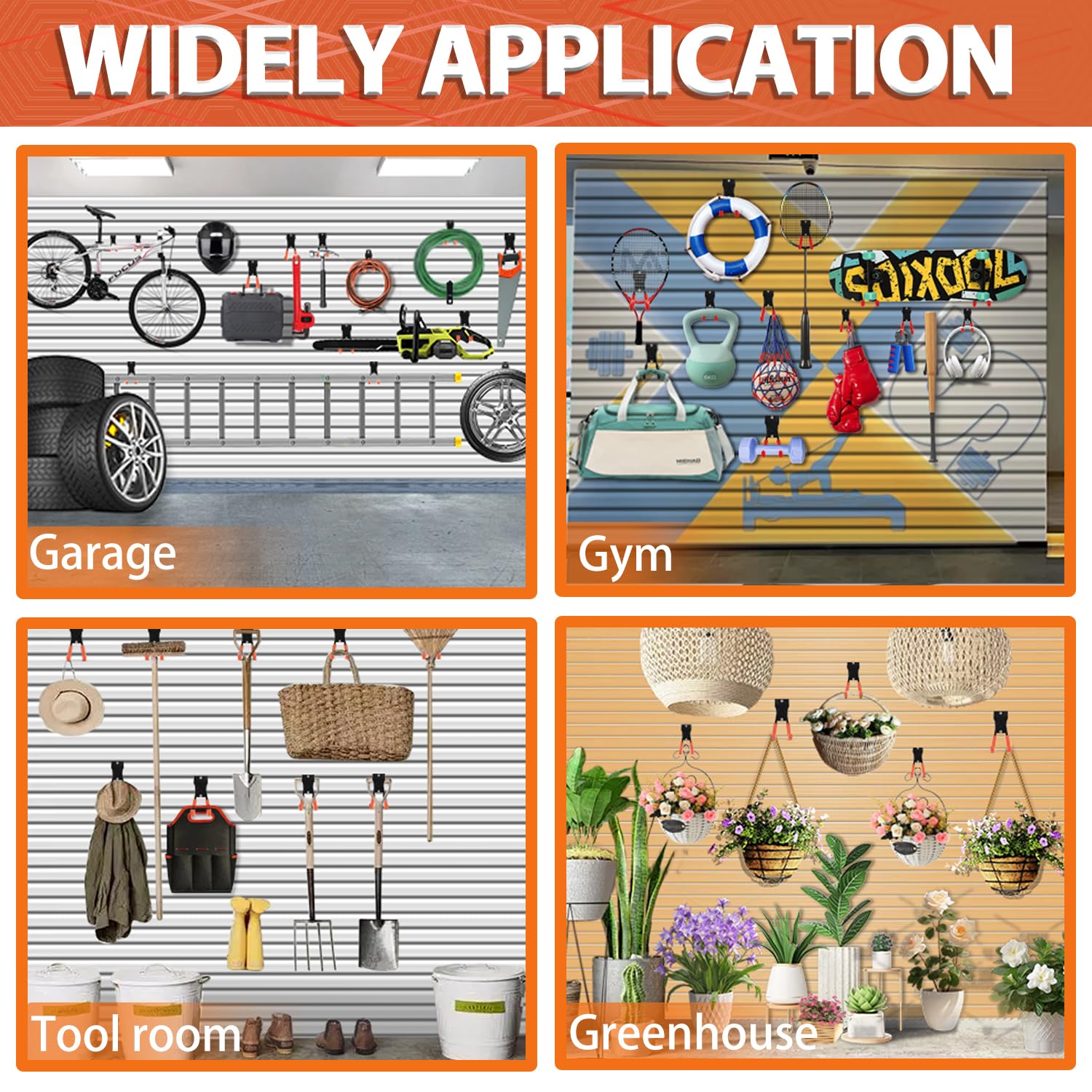 - Easy to Install and Space Saving: slat wall hooks fit standard slat wall like Proslat, Handiwall, Crownwall, etc., you can directly place slat wall hanging hooks to both sides of the panel groove, fix garage hooks for hanging into the groove on the panel then press slatwall brackets down and ladder hook will fit perfectly. Then you can move garage hooks to anywhere you want to put, saving you time and effort
