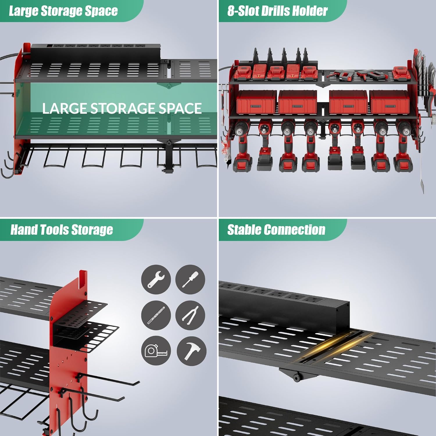 - Store Over 50 Tools: Our power tool rack efficiently organizes your charging stations, batteries, toolboxes, drill bits, hammers, and other garage tools. You can make the most of wasted wall space and save time searching for tools. This power tool storage rack is perfect for garages, homes, workshops, sheds, backyard shops, and more. The heavy-duty floating tool rack makes a perfect gift for fathers or husbands, helping them better manage and utilize their various tools.