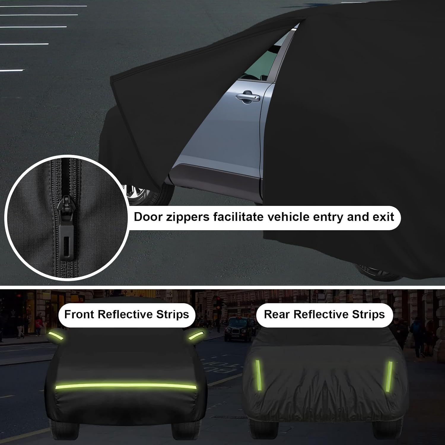 - 【Wind-Resistant Design】: The car cover has been specially designed to resist strong winds. (1) Full exterior car cover with Door Zipper in the left for easy access.(2)2 Windproof straps at Front&Middle Rear ,Adjustable elastic hems at the bottom and four-wheel straps allows you adjust the cover size easily.(3) 6 fluorescent light strips for reflective safety warning lines to protect your car for safe parking at night. (4)Pretty Mirror Pockets perfectly protect your mirror form damage.