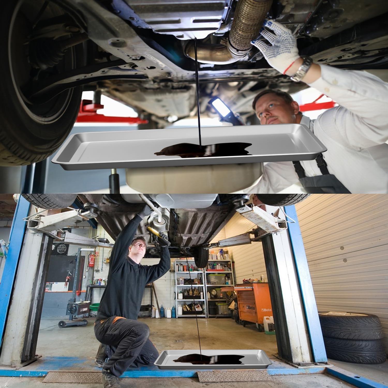 - RELIABLE AND STRONG MATERIAL: This automotive oil drain pan is made of high quality 403 stainless steel, not easy to break or deform, large enough to prevent oil from dripping onto the floor during maintenance, preventing damage to the floor, and is also suitable for oil changes, draining water and more. It is a reliable choice for car enthusiasts.