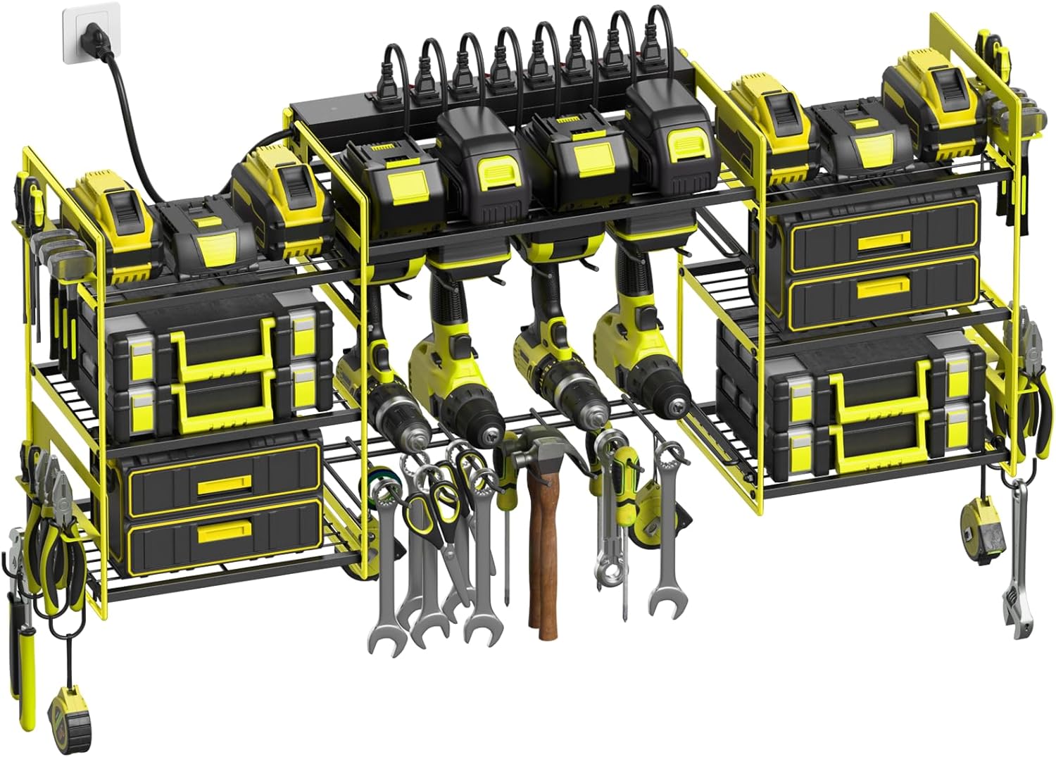 - About large size 39 inch long garage organizer with charging station, provides large enough storage space for 8 drills and 7 shelves. Open slot for up to 8 cordless drills, can also hang tools with holes if you don't have that many drills. The tools in the picture are for demonstration purposes only and are not included.