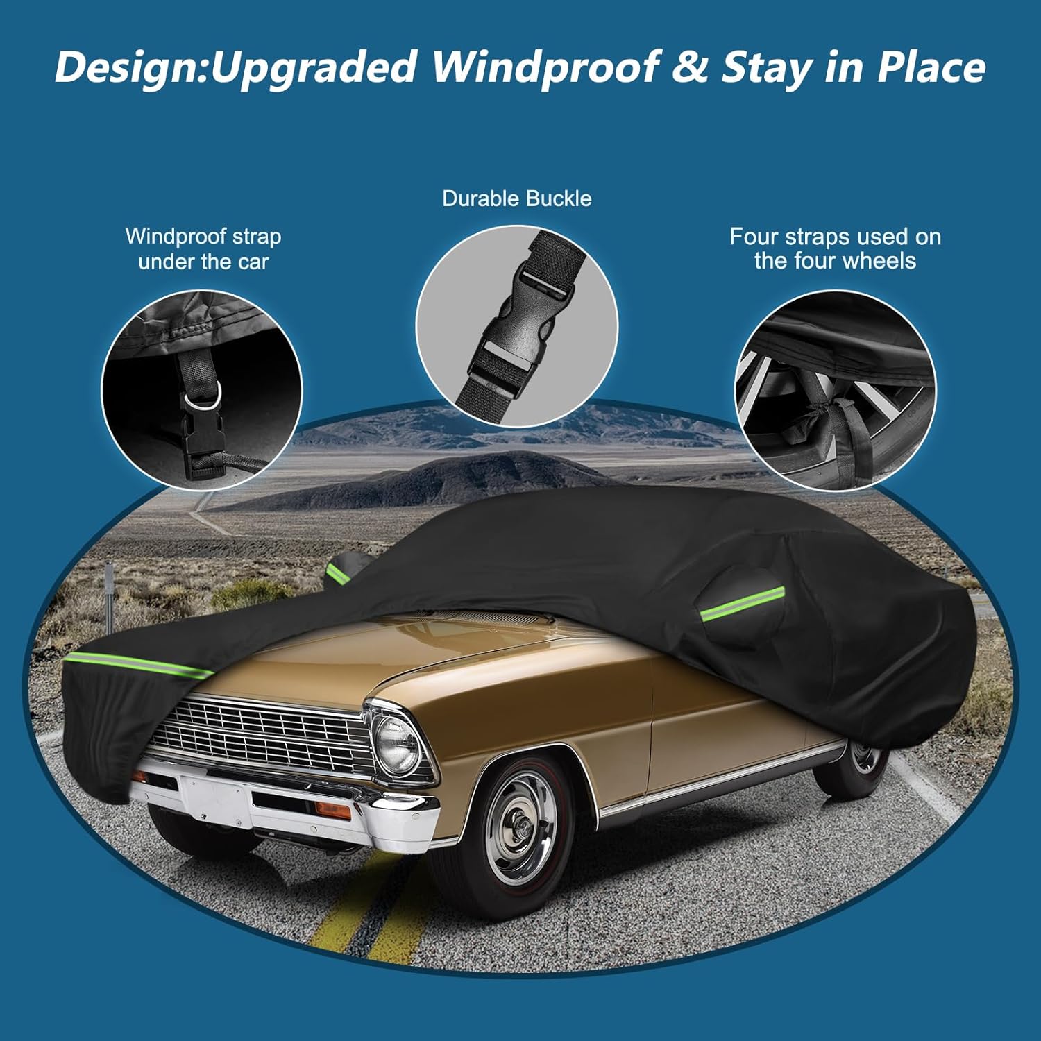 - ăUpgraded Windproof Design-Stay in Placeă*1. Four straps are used on the four wheels to make sure the cover stays in place. *2. A windproof buckle passes through the middle of the car. *3. Elastic hem at the bottom of front and rear to ensure the cover fits your car and to protect your car cover from blowing off, even in heavy wind. *4. There are two extra-long straps for the hood and rear wind protection.