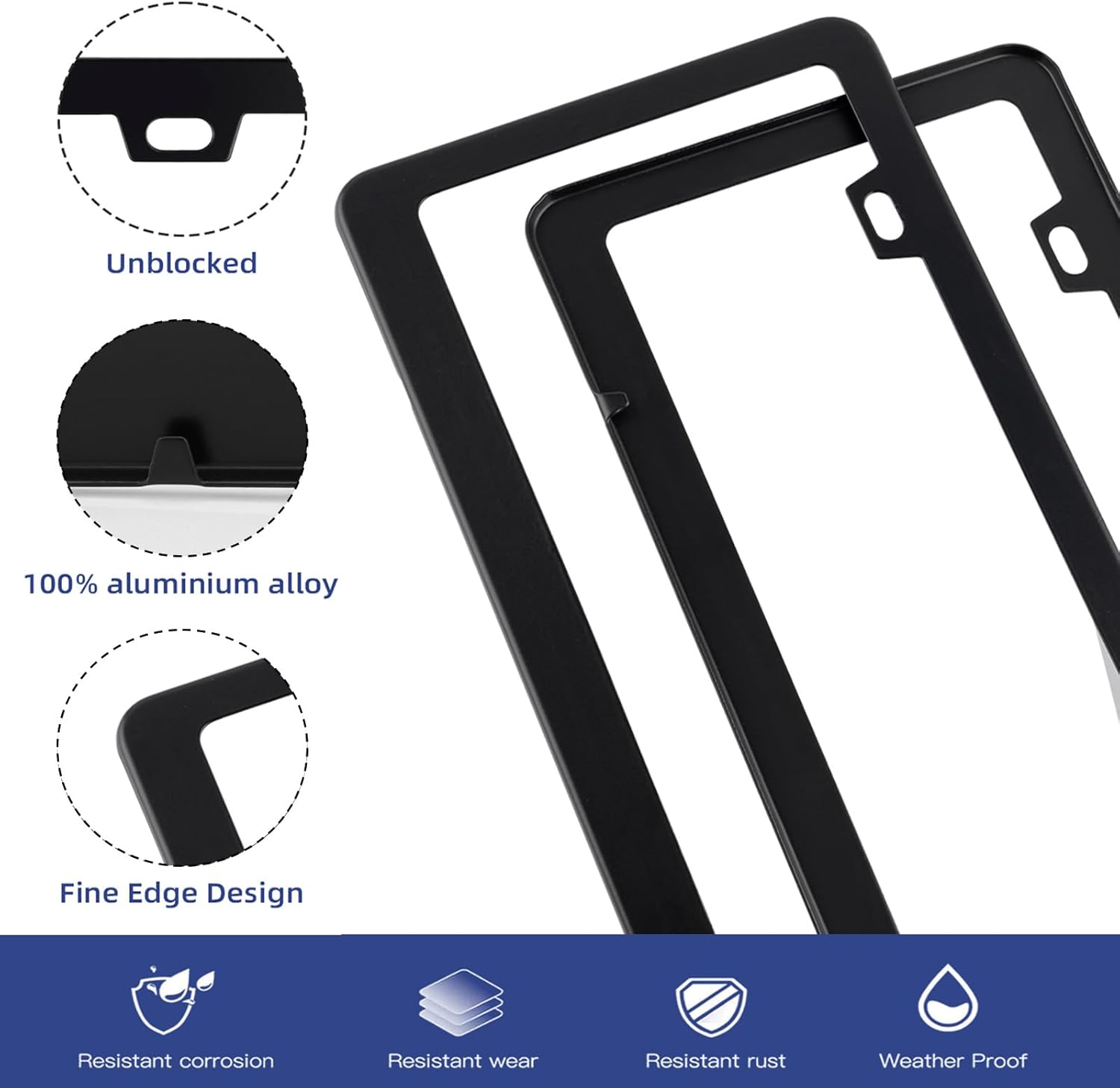 2 Pack Black License Plate Frame, Black Aluminum License Plate Cover, Matte License Plate Front and Rear 2 Packs. (2 Holes), Come with Screw Cap, Screw,Washer