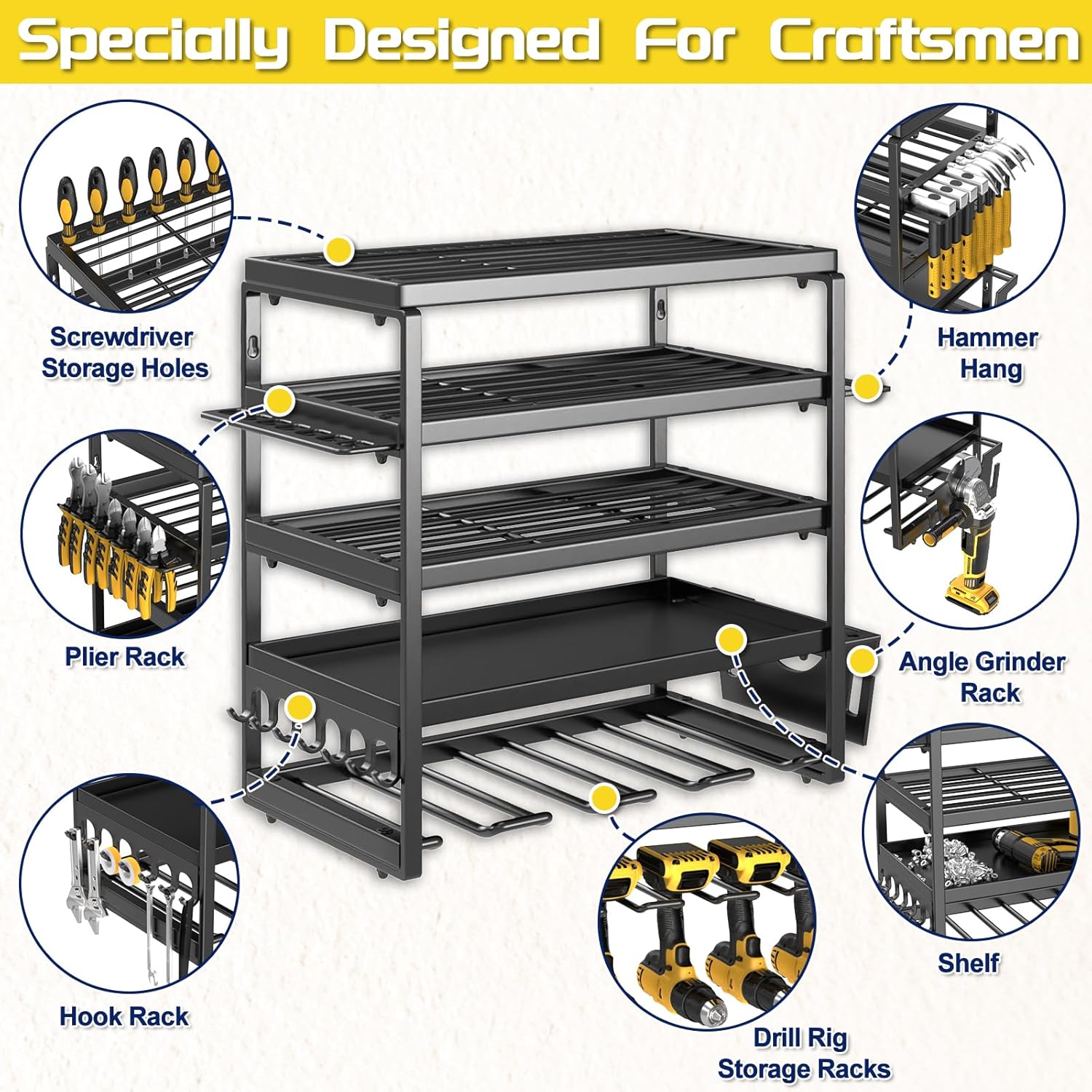 - Store 50+ Kinds of Tools:Our power tool storage rack is suitable for both indoor and outdoor use and compatible with pegboards. You can store your charging stations, batteries, toolboxes, drill bits, hammers, and other garage tools without any extra hassle