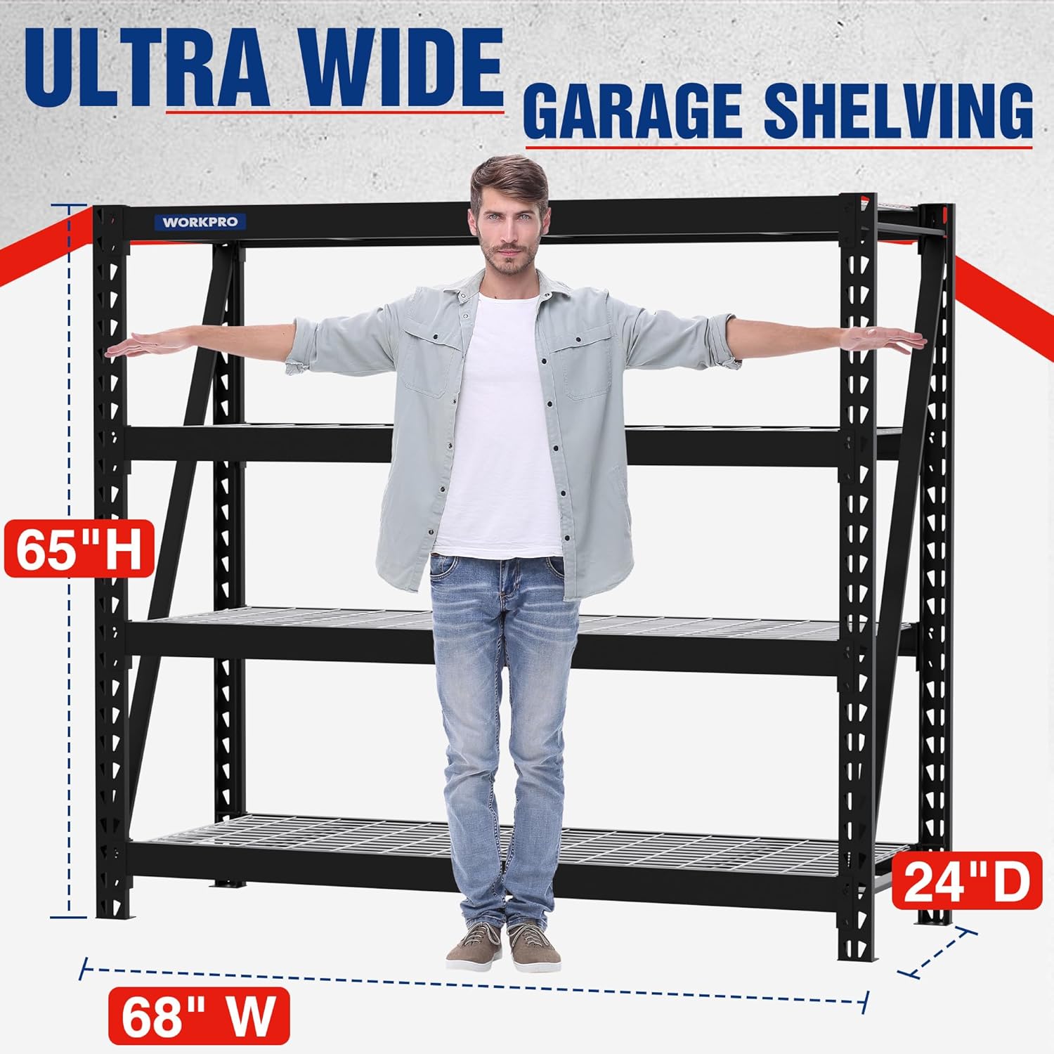 - 68” Extra Wide Beams - Impressive size: 68"W x 24"D x 65"H. Perfect for storing large tools, equipment, and other heavy items in your garage or workshop.