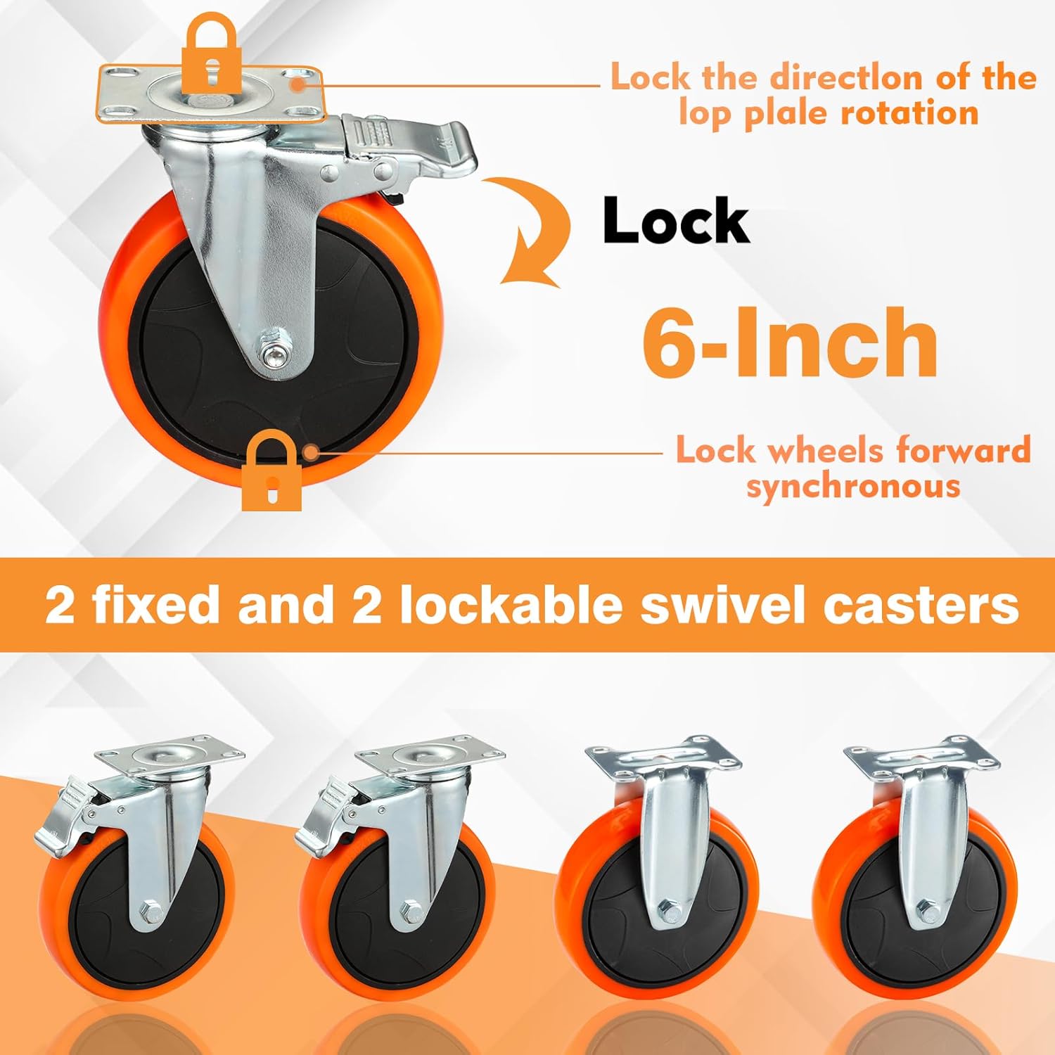 - ๐ PROFESSIONALLY DESIGNED WHEELS: 2 fixed and 2 swivel 6-inch wheels (2 with Brake) are made of industrial-strength polypropylene and non-marking polyurethane (PU) rubber. The swivel wheels can easily rotate 360 degrees flexibly, and the inner double ball bearings make the rotation and rolling more effortless and labor-saving. The locking mechanism synchronously locks the rotation and the wheel frame, thus achieving effective and fast braking.