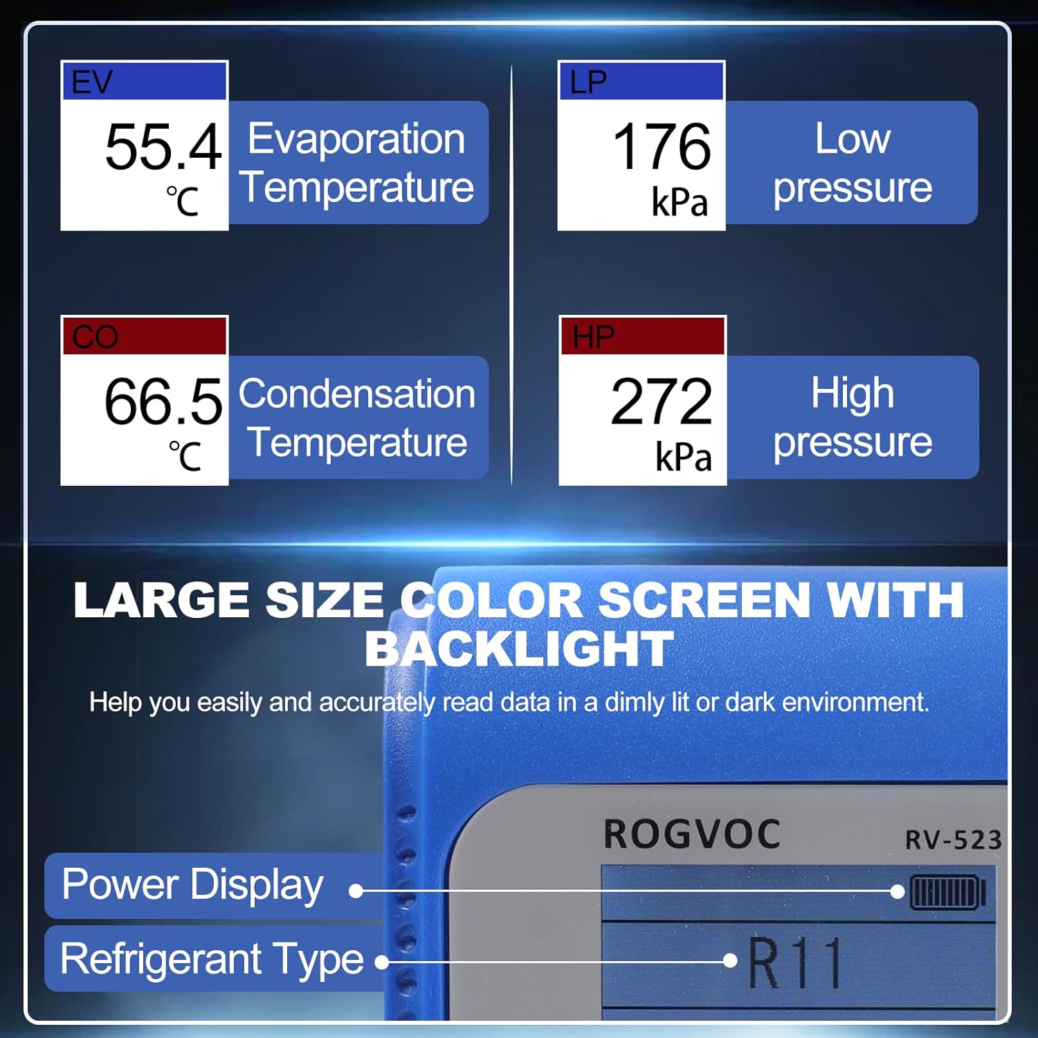 - DIGITAL MANIFOLD GAUGE SET: Rogvoc manifold gauges have functions such as refrigerant filling, pressure and air tightness test, vacuuming, etc. Built-in 92 types of refrigerant data can be switched or filled with different types of refrigerants according to needs. The 32-bit digital precision data acquisition unit has good data stability, making the pressure data measurement more stable and accurate