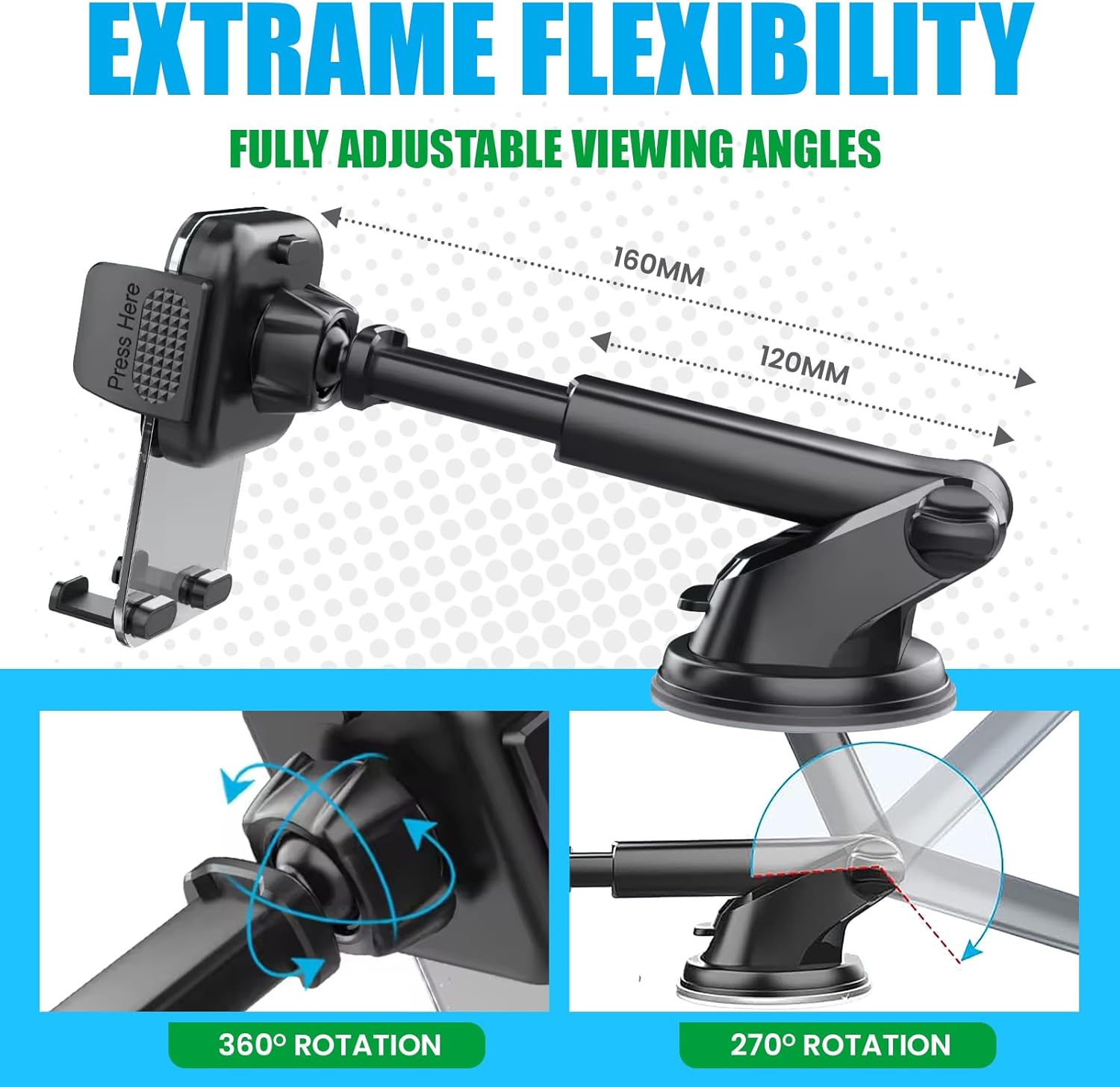 - 360-Degree Rotation: YOZAT car phone holder with 360-degree rotation allows you to position your phone in portrait or landscape mode, making it easier to use navigation apps or watch videos. Some mounts feature an adjustable arm or telescopic neck, providing additional flexibility to position your phone exactly where you need it.