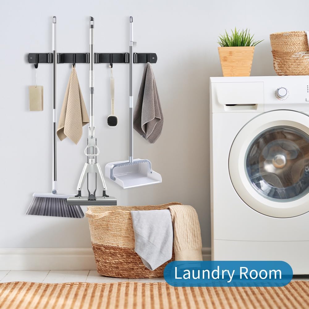 - 🏠【HIGH CAPACITY】: Each broom organizer wall mount has 5 rubber roller clips and 4 hooks, there are total 9 positions for mops, brooms, duster, shovels etc. Push them into the clamps with easy after finish your household cleaning. It can help you utilize your space to the maximized extent and make itmuch easier to store and take objects.