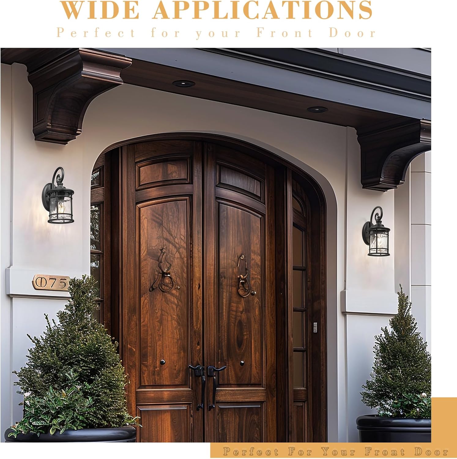 Emliviar Outdoor Wall Sconces 2 Pack, 12.4 Inch Outdoor Front Porch Lights with Water Ripple Glass in Black Finish, XE229BWG-S-2PK BK