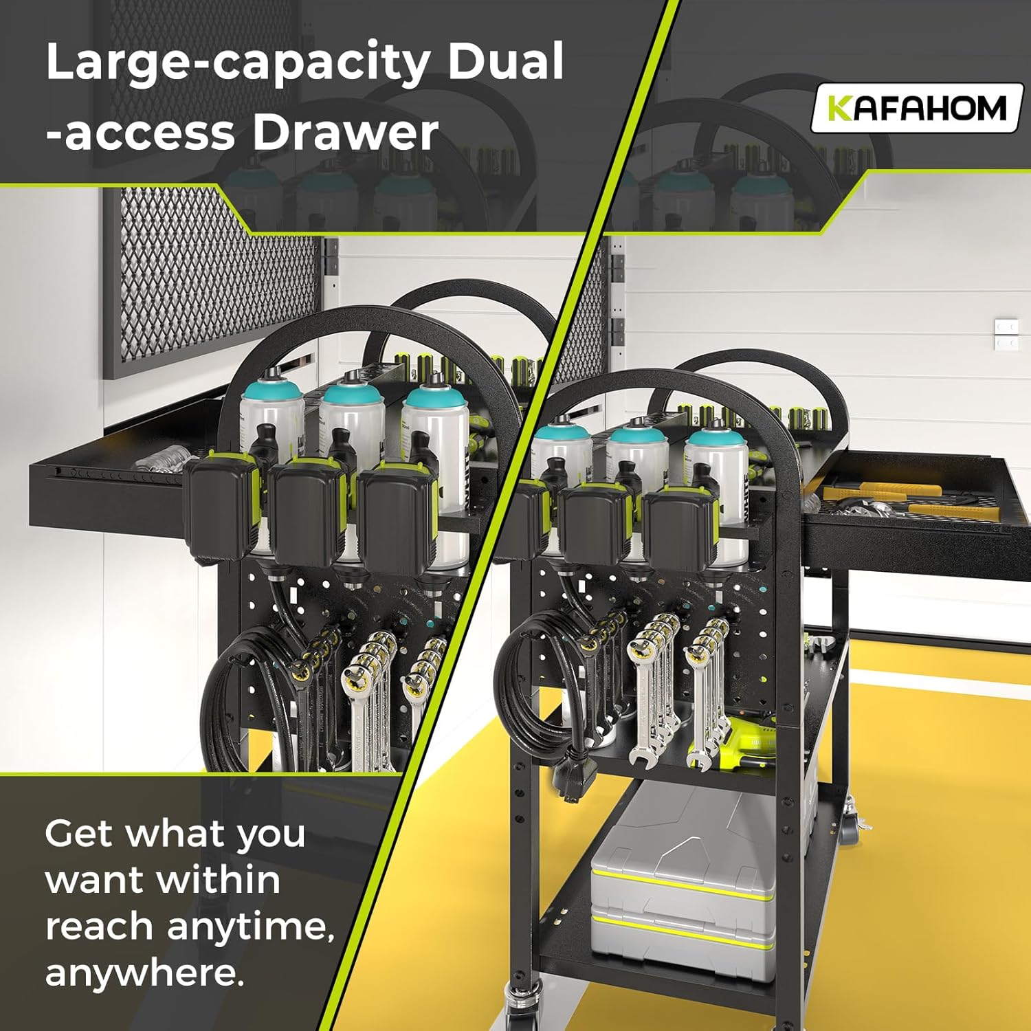 - High-Congregate Design: Enjoy excellent efficiency with our customizable features, including adjustable chargers that can be positioned on any tier, a swift-access drawer, a 3-level-available middle layer, and a spacious ground floor for large items. But that's not all—customize your setup with a side pegboard, four long hooks, a power tools rack, and a handy tools holder. At KAFAHOM, we strive for a perfectly organized environment that meets all your needs.