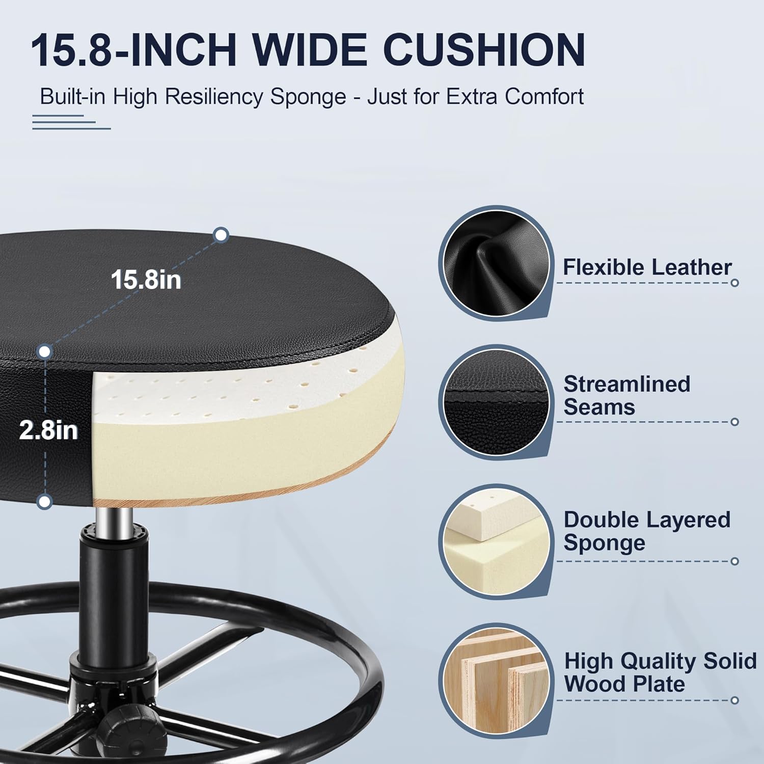 - Details Determine Quality: This Rolling Stool is made of quality PU leather, making it easy to clean and maintain. It's filled with soft, high-density memory foam and features smooth, silent rollers for a comfortable seating experience for long periods of time