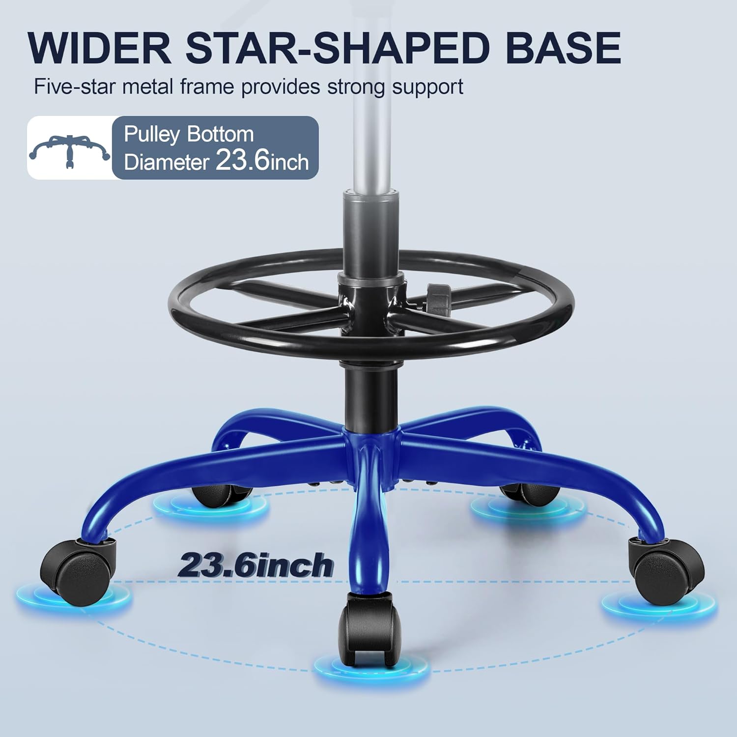 - Humanization Design: 15.8-inch cushion, more suitable for the comfortable size of most people; 23.6-inch five-star casters drafting chair, less prone to tipping over and more stable. The 2mm thick base supports up to 300 pounds