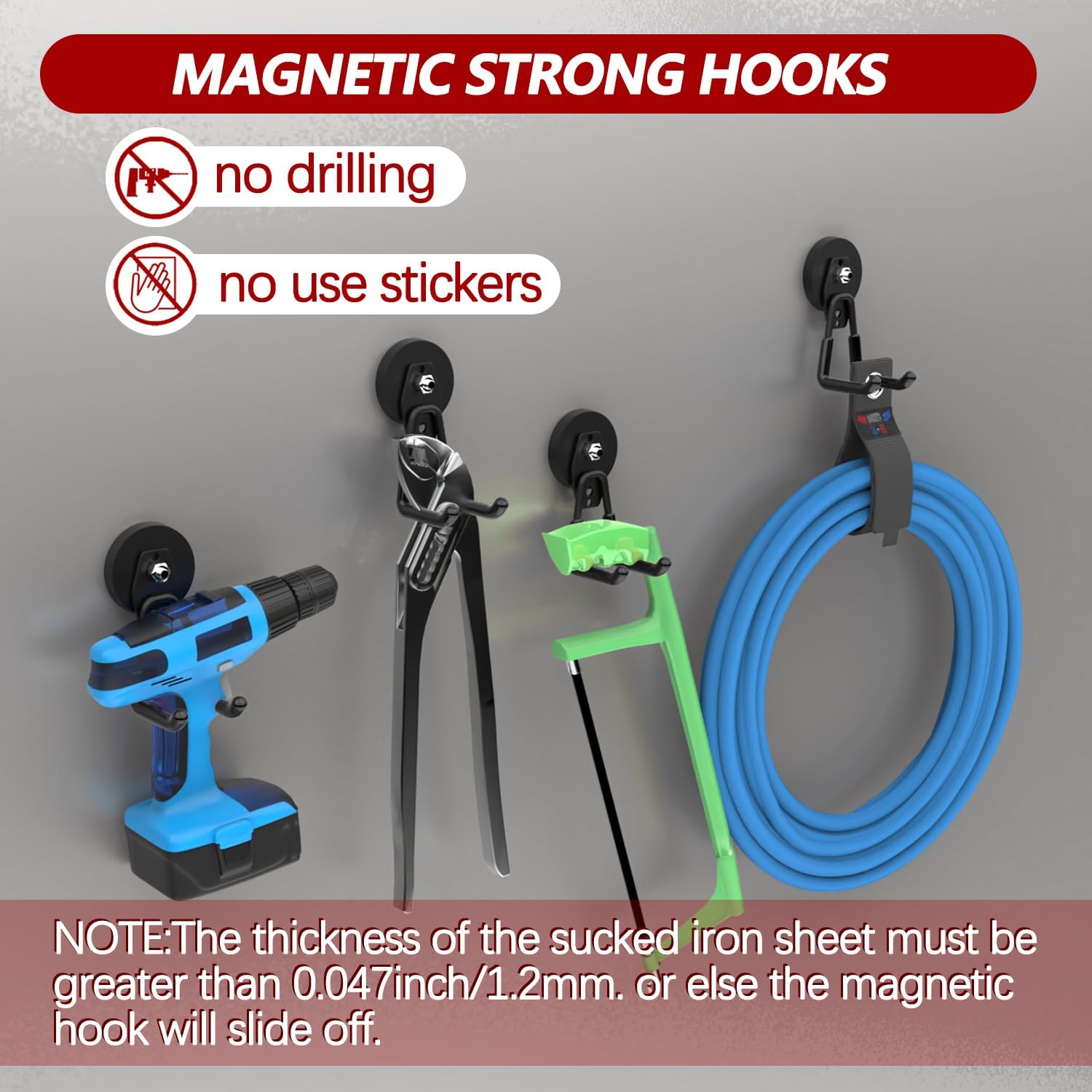 - Innovative No-Drill Magnetic Hooks: Eliminate the need to punch holes and effortlessly adhere magnet hooks to any metal surface, you can move them around as your needs change. The large magnetic hook has a dual-hook design for versatile use and can be separated into magnet and hook components. Our magnets with garage hooks heavy duty are coated with non-slip PVC and has protective sleeves to prevent scratches and rust