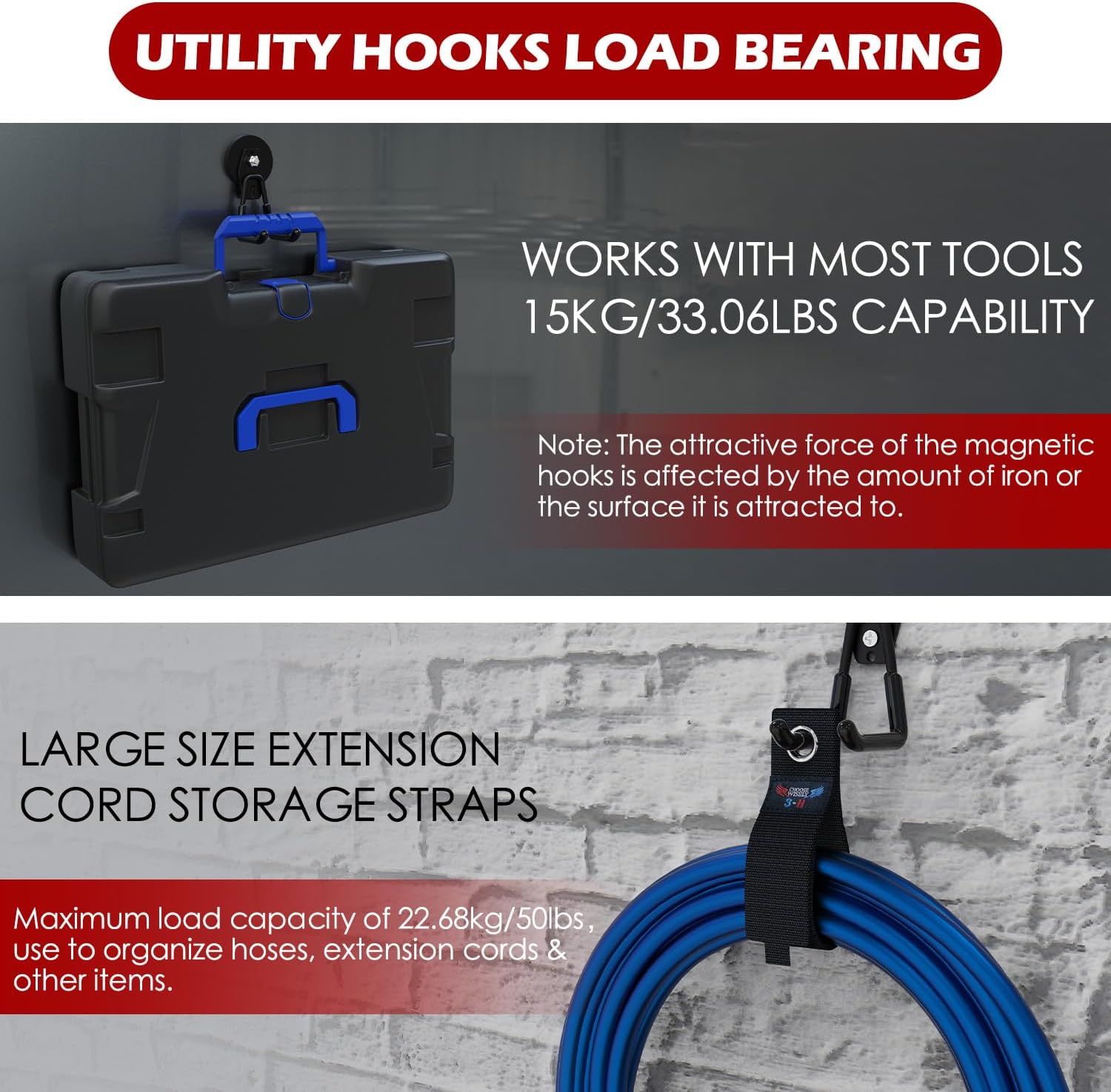 - Extremely Strong Magnetic: The magnet features a soft, high-friction rubber exterior and 6 powerful internal magnets for enhanced adhesion. The heavy-duty magnetic hooks, with their upgraded magnetic force, now offer even greater load capacity in both horizontal and vertical orientations.Note: The thickness of the adsorption iron sheet must be greater than 0.047inch/1.2mm, otherwise the magnetic hook will slip off