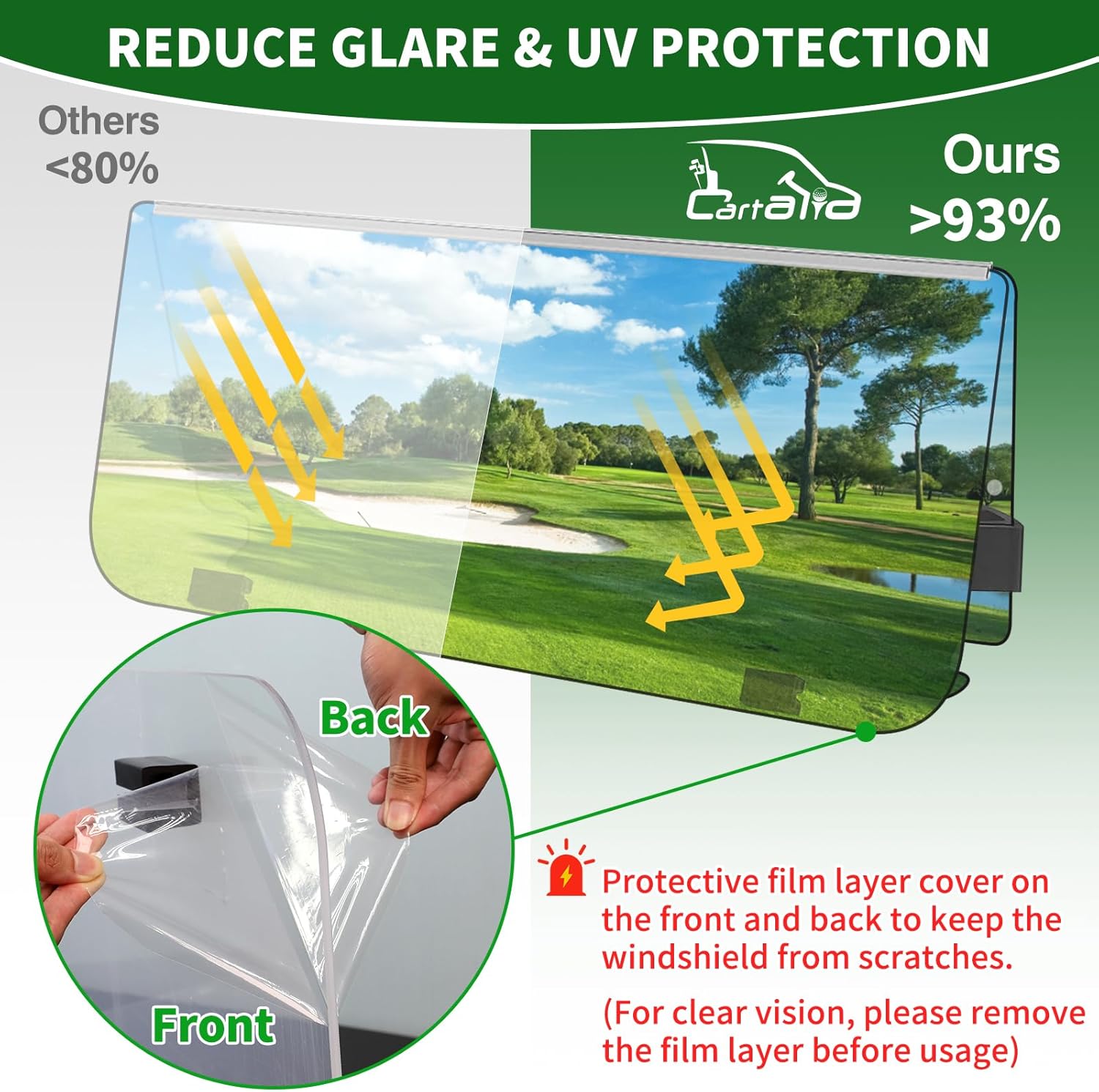 - Protective Packing: Comes with protective foam packing to prevent damage in transit and protective film to prevent scratches on glass. Please remember to remove both sides of the film on the upper and bottom windshield before using the golf cart windshield yamaha