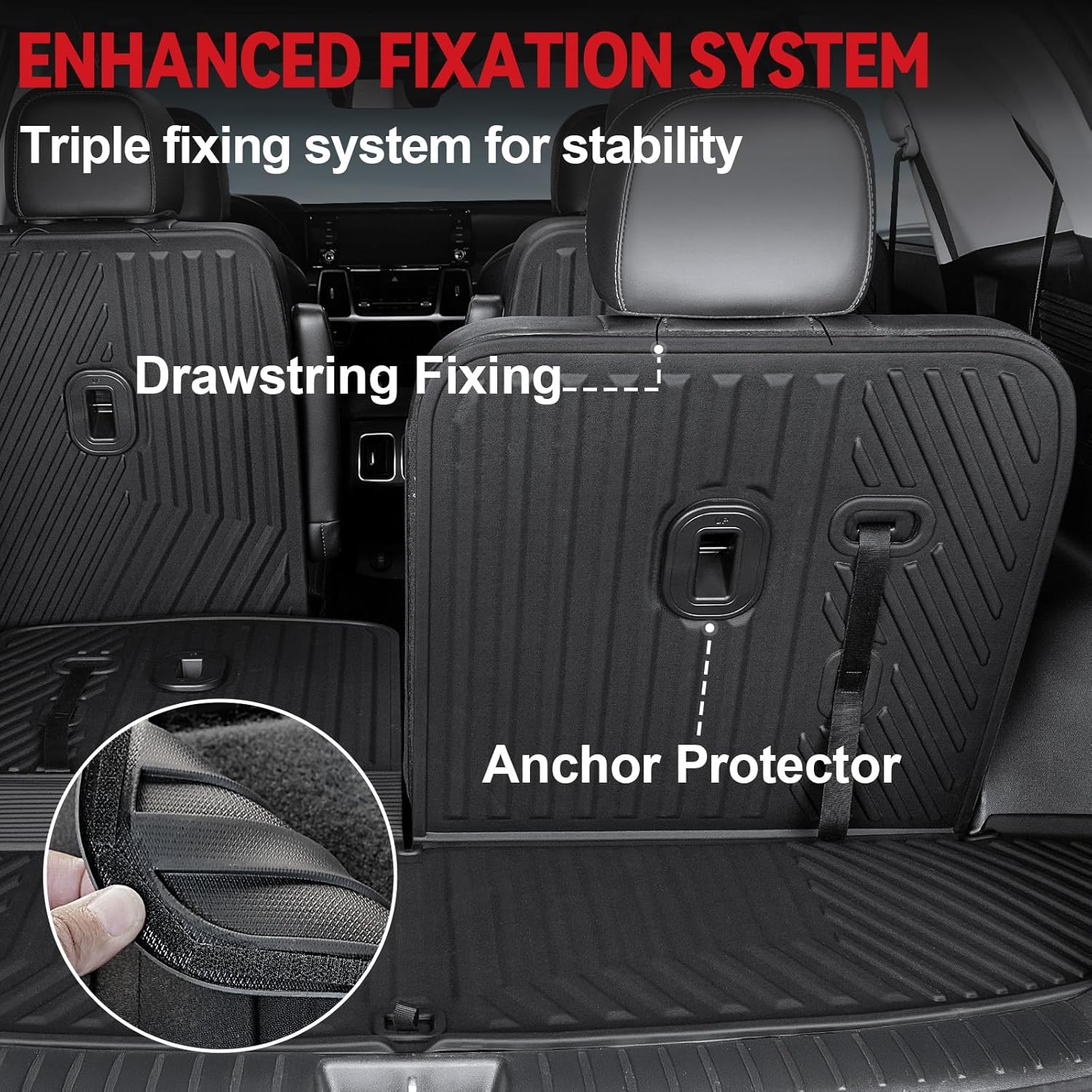 - Triplex Fixation: The rear seat covers hook-and-loop to grip securely to the seat back. Attached drawstring and top tether protectors reinforce seatback installation
