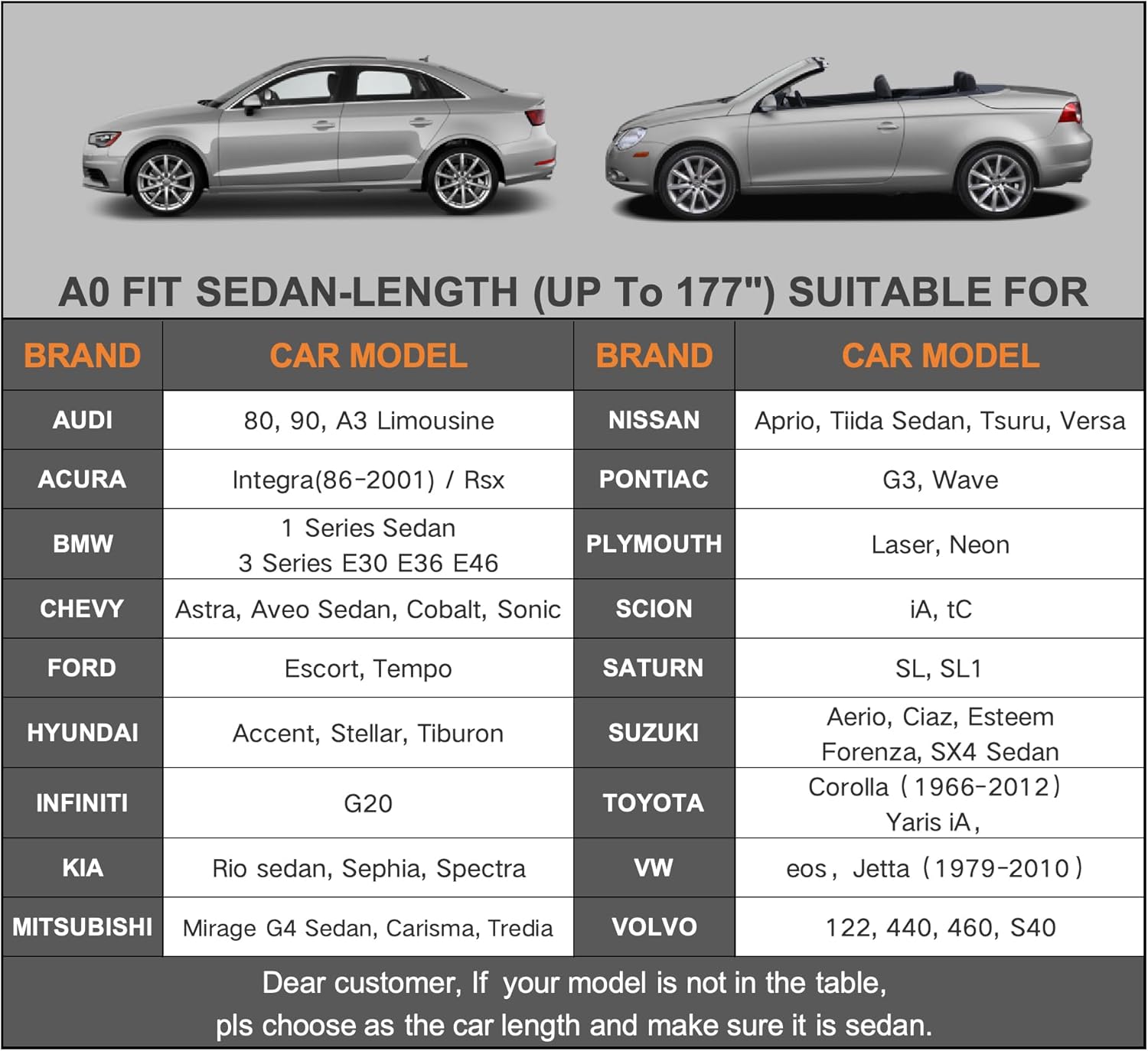 - ăDimension A0ăâ Universal fit for sedan which length is up to 177 inch (NOT FOR SUV AND HATCHBACK). Suitable for BMW 3 Series E46 E36 E30, Nissan Versa, Dodge Neon, Mitsubishi Mirage, Audi A3 sedan, Acura Integra/Rsx, Hyundai Accent, Volkswagen eos, Toyota Celica,Chevy Cobalt etc.