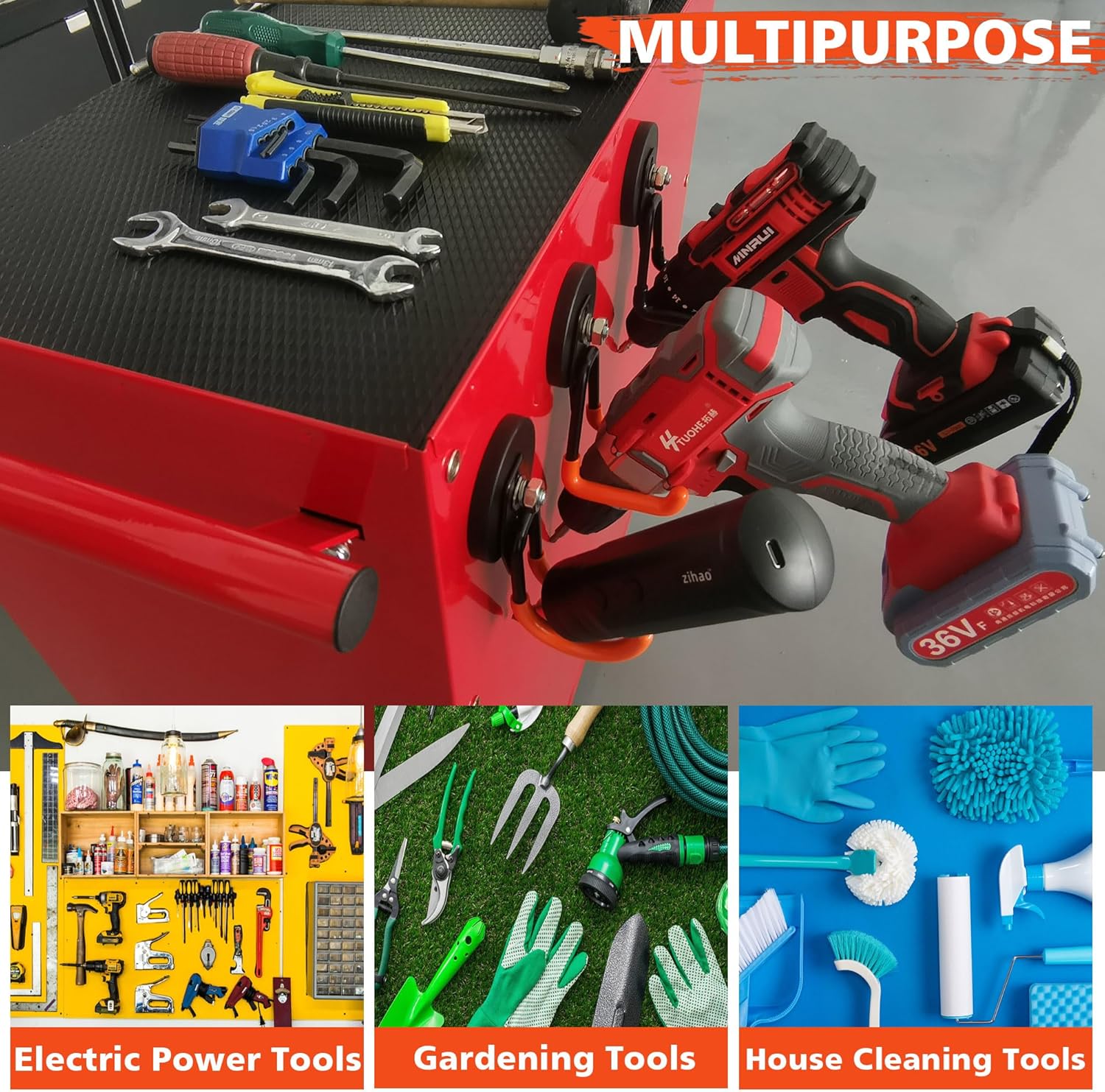 - [Heavy Duty Magnetic Hook]: Garage storage hook has two holes, which can easily support the weight and can hang most items. Applicable to scenes such as kitchens, garages, warehouses, offices, etc.Can accommodate various tools and equipment, such as hoses, skates, gym bags, shovel, rake, broom, mop and other garden tools
