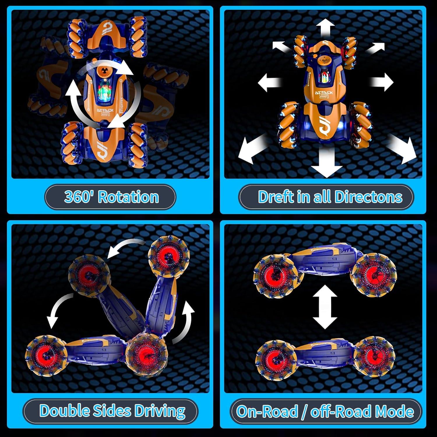 - 360-Multiple Stunts:awesome stunts such as Drifting all direction, moving sideways, and revolving 360 degrees…Forward/backward,turn right/left, right/left drift, extreme 360 rolling, double-sided 4WD driving, transform mode,Whether playing indoors or outdoors, It’s a thrilling way for kids to explore physics and mechanics,will keep them captivated for hours,Very cool kids toys boys 6-8-12