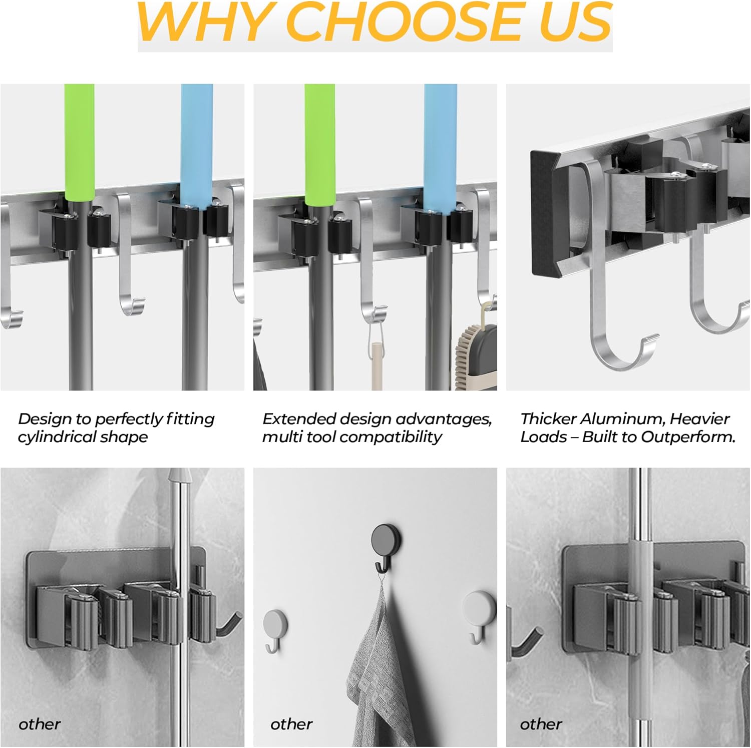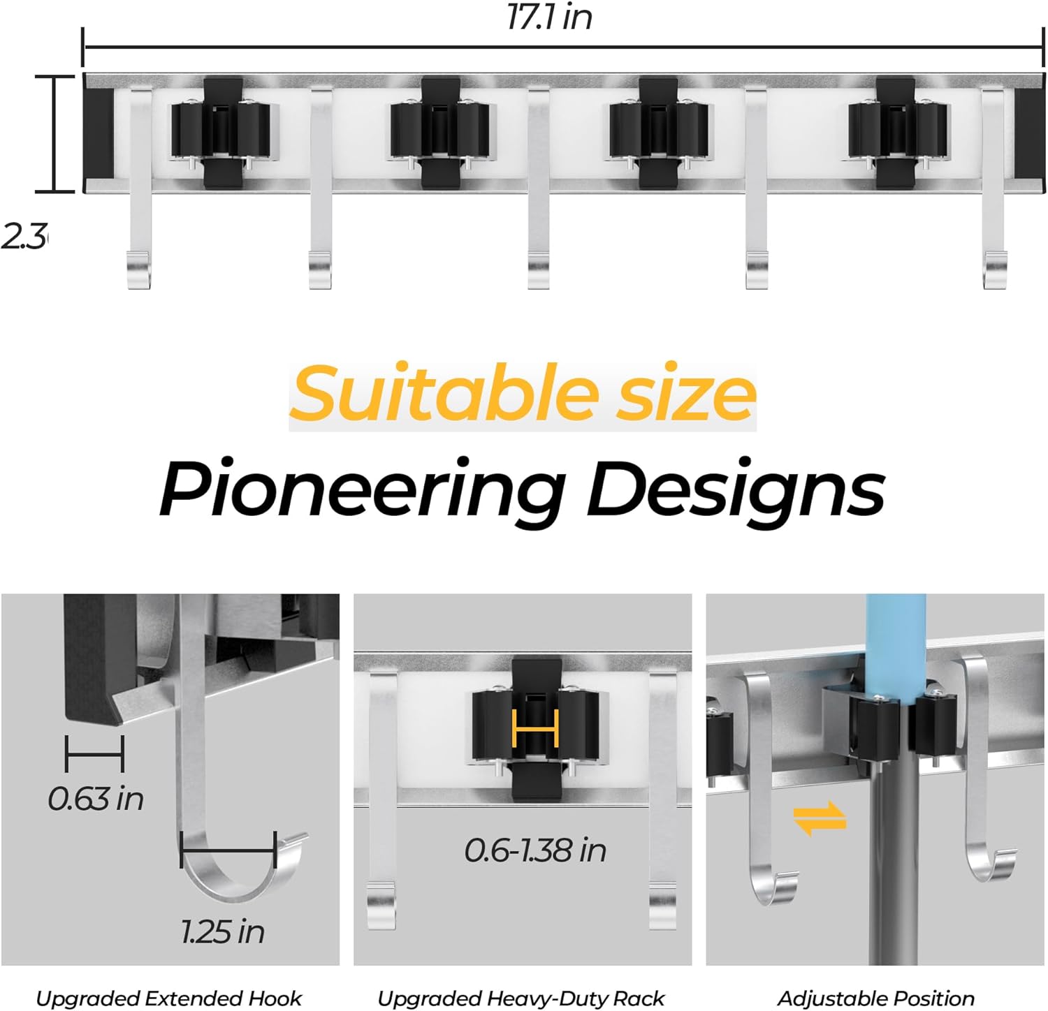 - [Extended Hooks] Five extra long thickened aluminum alloy hooks let you neatly store brooms, mops, rakes, hoses, garden sprayers, or even dustpans and small sports gear, making this your go to garage tool organizer for a clutter free workspace.