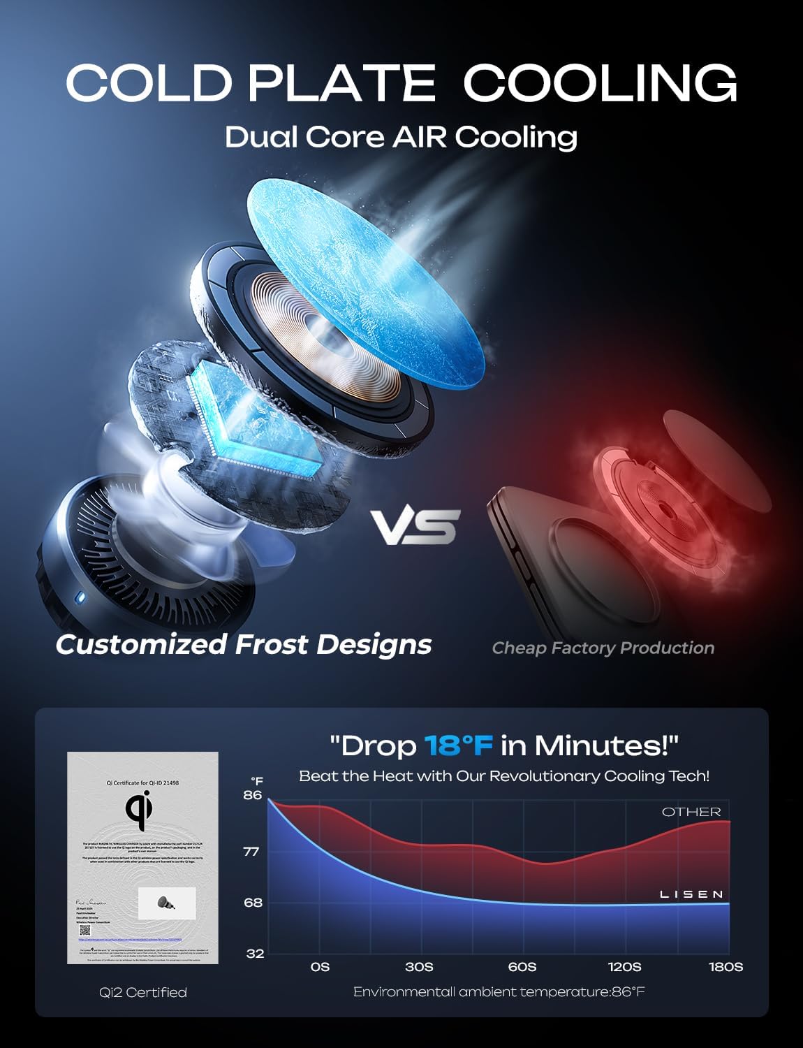 LISEN for Qi2 15W MagSafe Car Mount Charger, [Rapid Cooling Drop 17 ℉ in Minutes] Wireless Magnetic Car Mount for iPhone Car Charger, Includes Vent/Dashboard Phone Holder & Fast Car Charger USB C