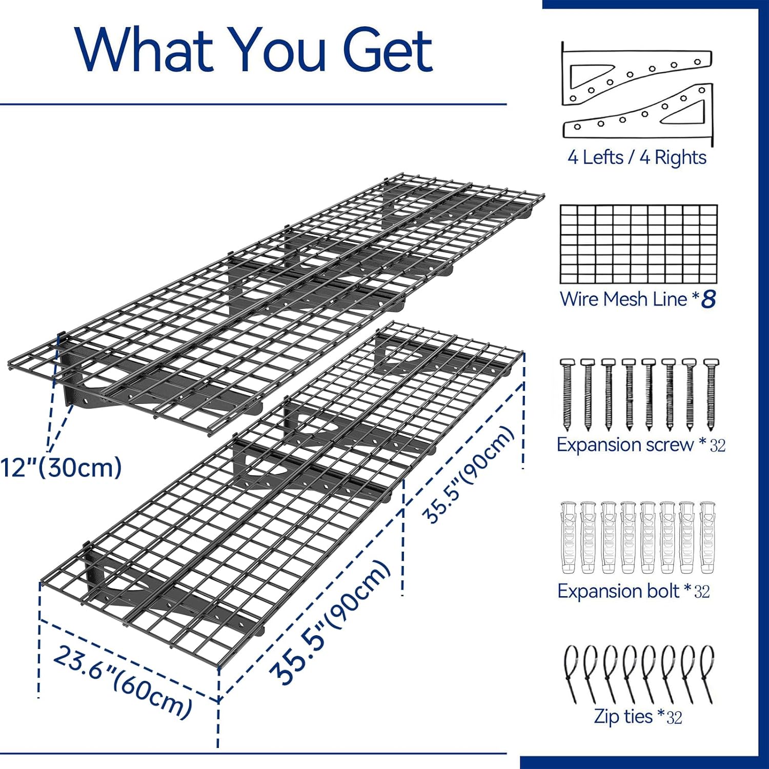 - INTRODUCE:The size of the mesh frame is 70.86"W x 23.6"D (180x60cm/2x6ft), the height of the support frame is 12"H (30cm/1ft).Perfect for holding storage bins, boxes, tires, tools, and more. Maximize your garage organization with ease