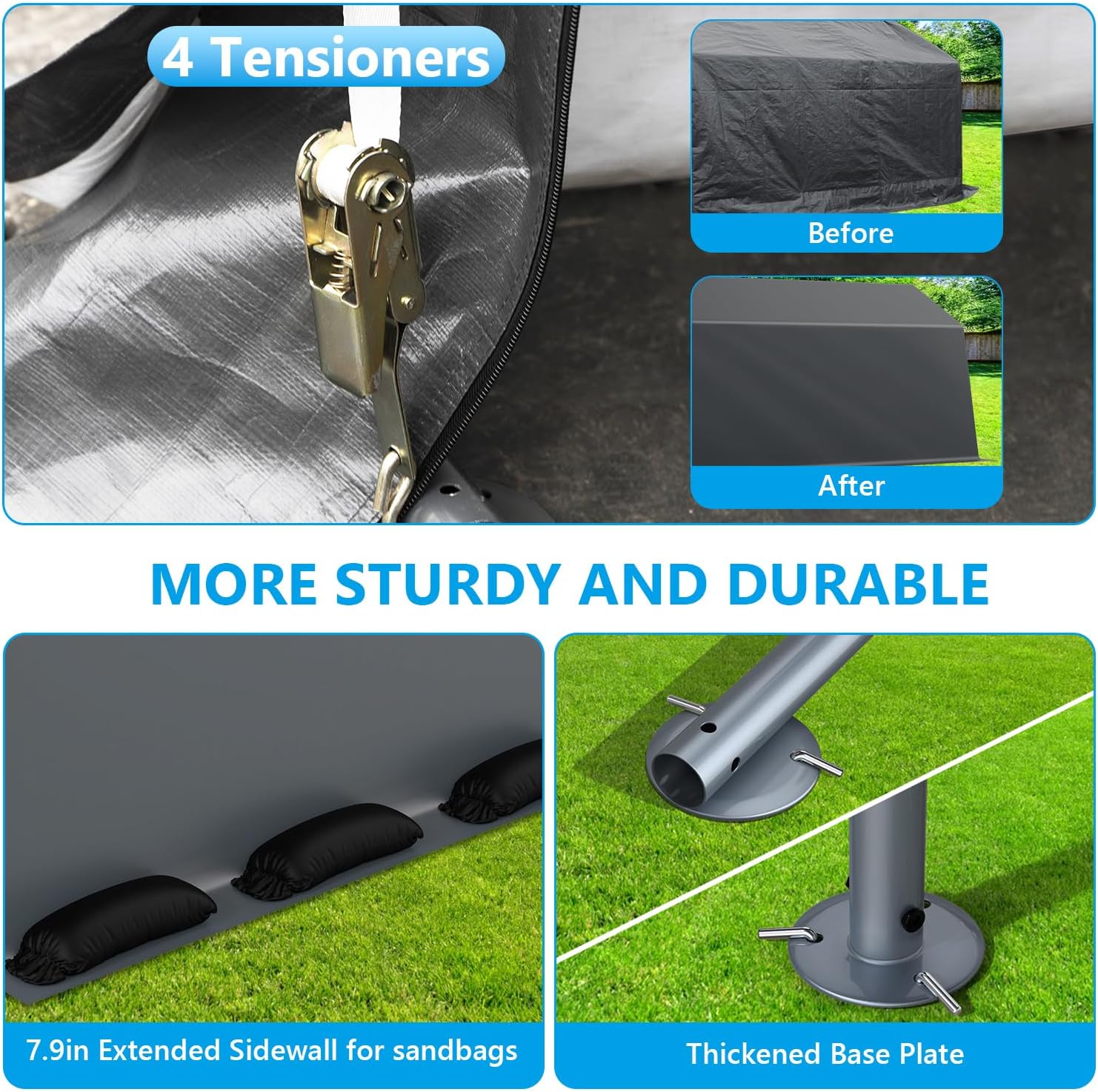 - Sturdy Steel Frame: The whole frame is made from a rust-resistant powder-coated steel frame that prevents chipping, peeling, rust, and corrosion. The solid legs are consists of 1.5inch diameter and 1.2mm Thicken poles, It makes the whole Storage Shelter Carport much safer and more stable.