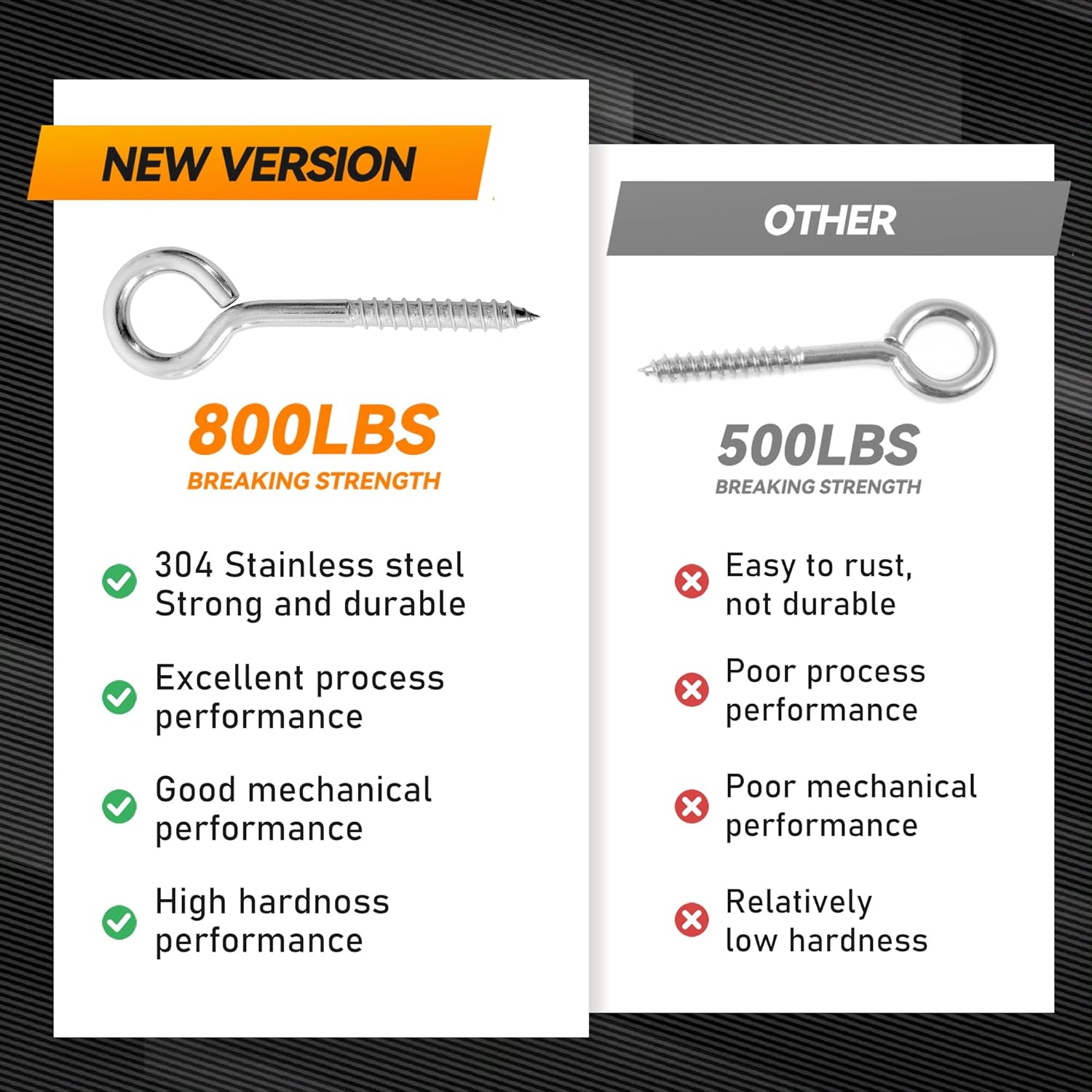 2Pcs 6 Inch Heavy Duty Screw Eyes Hooks, 304 Stainless Steel Self Tapping Eyelet Screw Eye Bolts,800LBS Breaking Strength, Screw in Eye Hooks for Wood Securing Cables Wire. (2, M10-6 Inch)