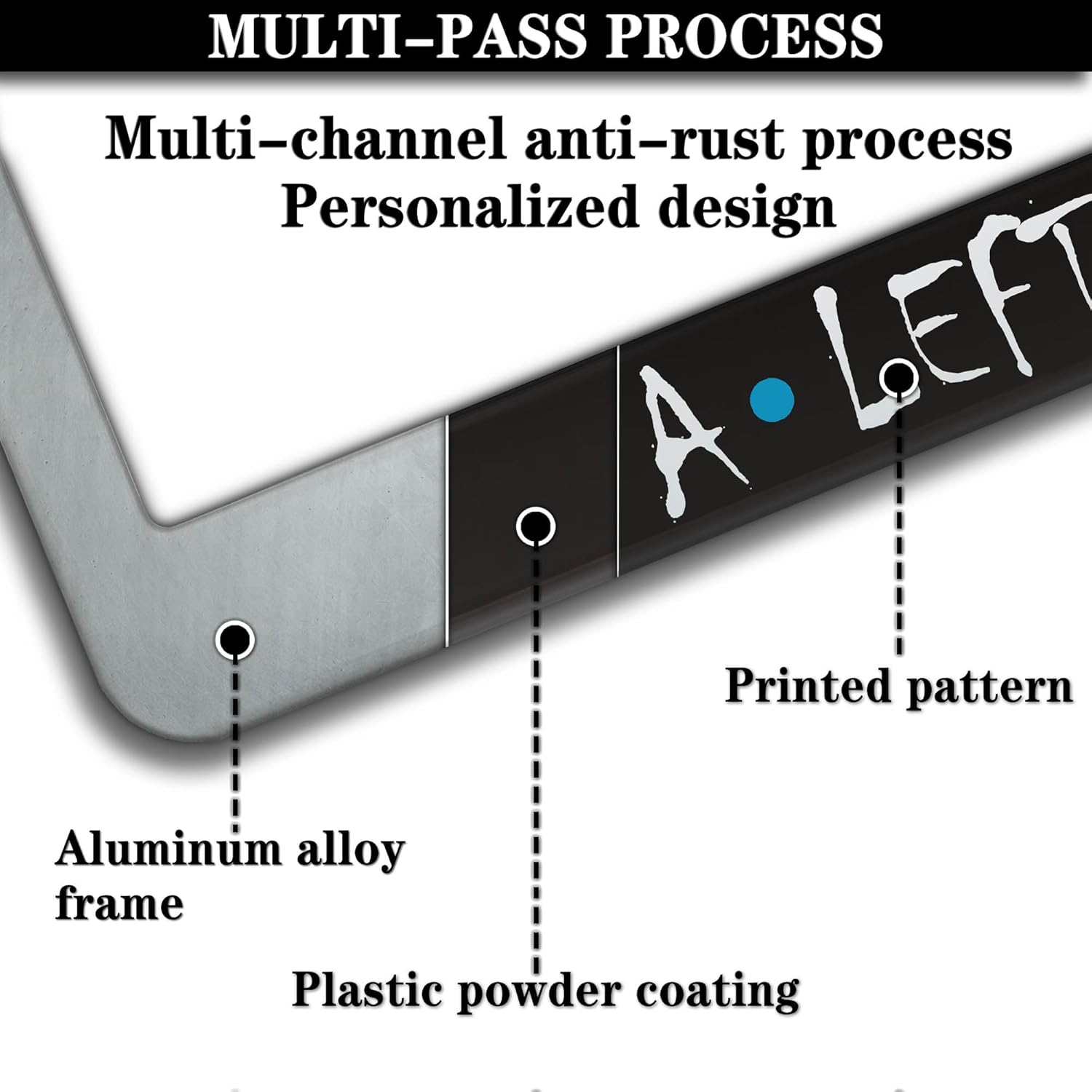 - ALUMINUM FRAME: This License Plate Frame is crafted from high-quality aluminum that is resistant to corrosion, rust, and harsh weather conditions. Its rugged reliability design ensures a long lifespan, making it capable of withstanding car washes and extreme weather, providing you with a reliable and stylish solution for your vehicle.