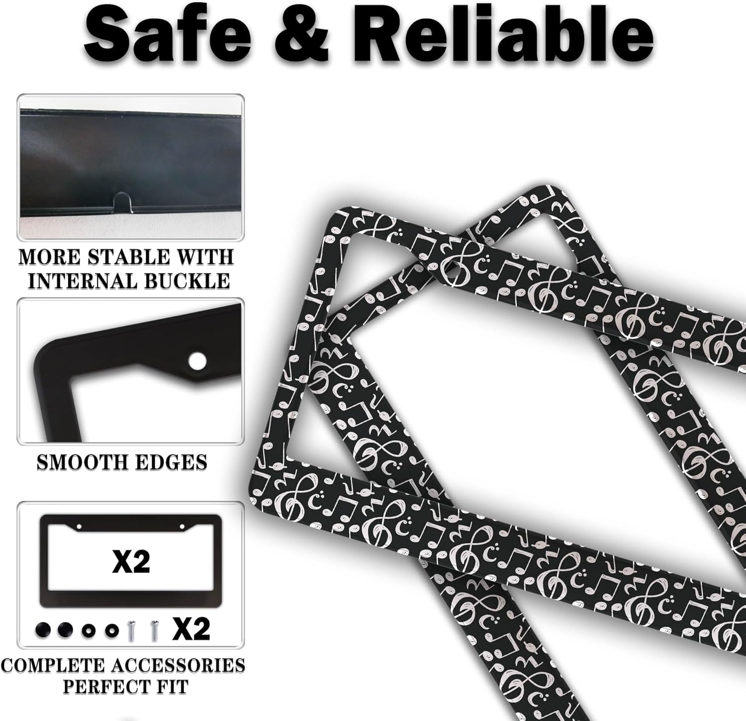 License Plate Cover for Car Black and White License Plate Frames Music Musical Note Aluminum Metal Car Accessory 2 Pack with Screw Covers Set