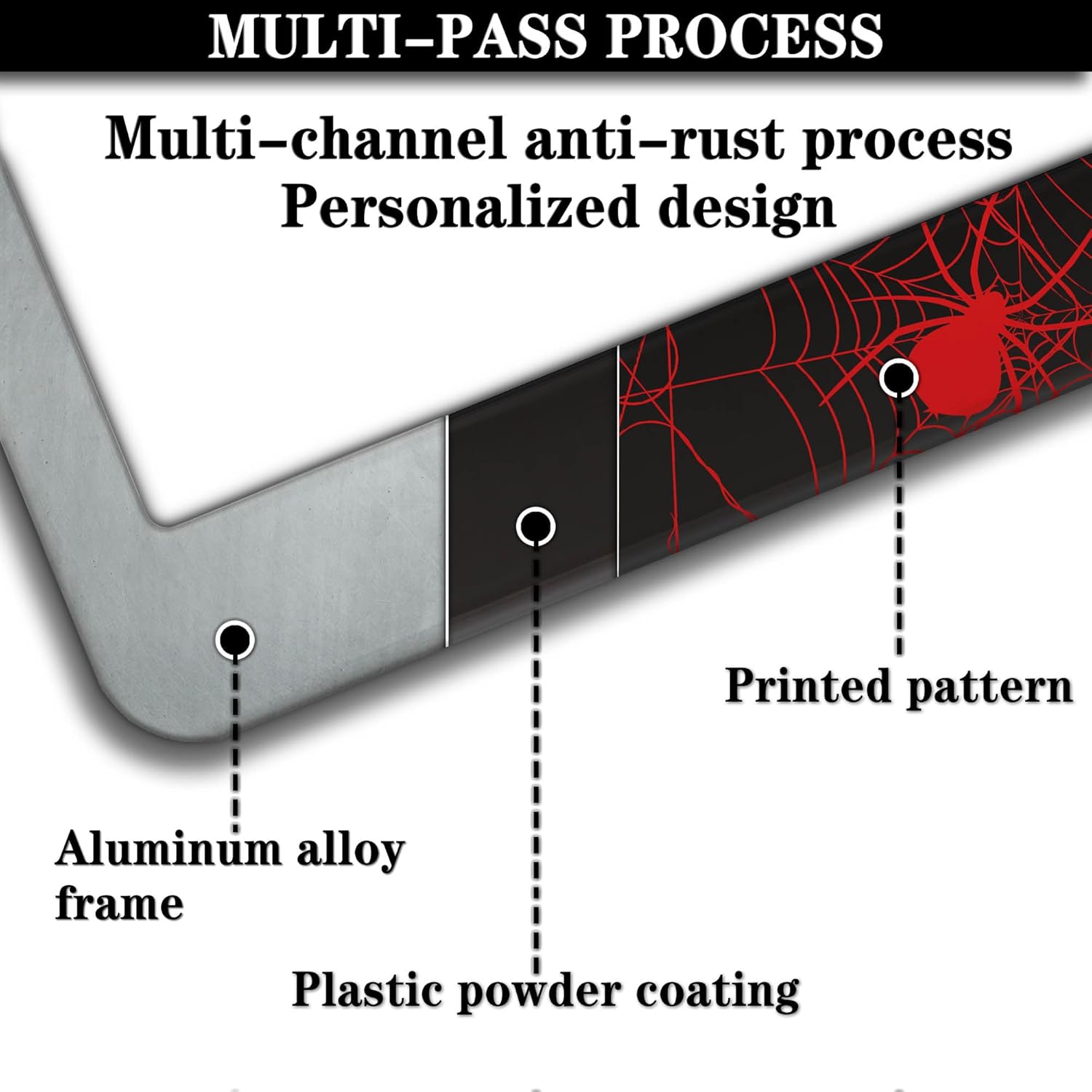 - ALUMINUM FRAME: This License Plate Frame is crafted from high-quality aluminum that is resistant to corrosion, rust, and harsh weather conditions. Its rugged reliability design ensures a long lifespan, making it capable of withstanding car washes and extreme weather, providing you with a reliable and stylish solution for your vehicle.