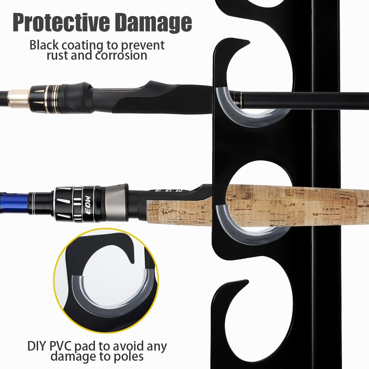 - Space-Saving Design: Wall and ceiling-mounted options free up floor space, keeping your fishing area organized and clutter-free, allowing for quick selection and retrieval when heading out for a fishing trip. Firmly holds rods in place to prevent them from falling or getting tangled, providing peace of mind for storage. Say goodbye to garage room clutter and make the most of your space with this space-saving solution.
