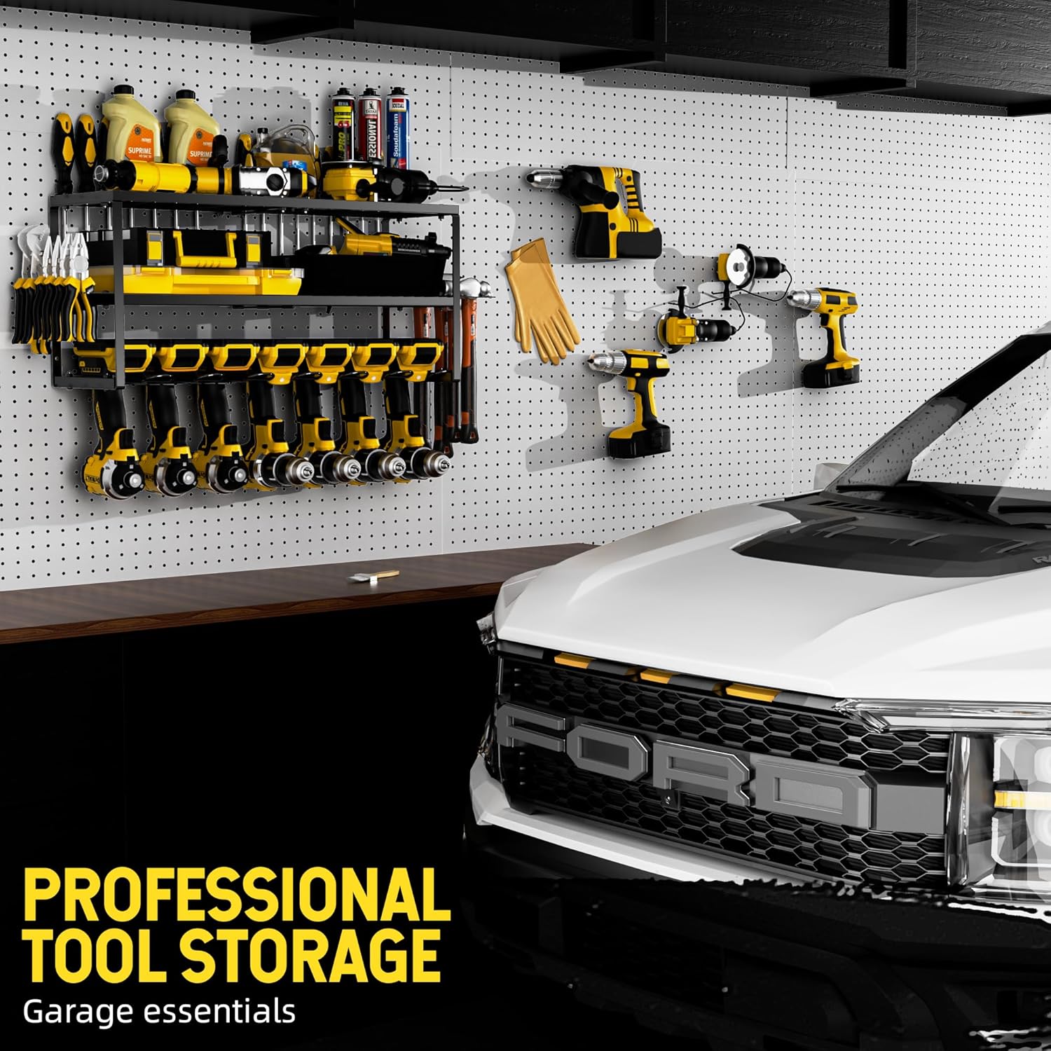 - Extra Large Tool Organizer: 7 Drill Slots & 3-Tier Design Maximize your workspace with this heavy-duty wall-mounted power tool organizer. Store up to 7 cordless drills on the bottom tier, while the upper 2 tiers hold heavy tools or small essentials. Bonus: side slots for hammers, pliers, and screwdrivers!