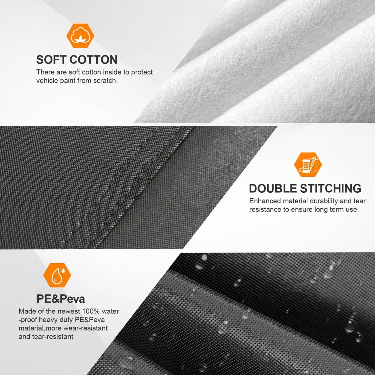 - ăEnhanced Material ProtectionăFeaturing the latest thickened material design: 1. Waterproof and wear-resistant exterior coating; 2. Reinforced tear-resistant synthetic fabric; 3. Soft and breathable cotton lining. Ensures all-weather protection, durability, and aging resistance for the car cover, while safeguarding your vehicle's paint from scratches and abrasion.