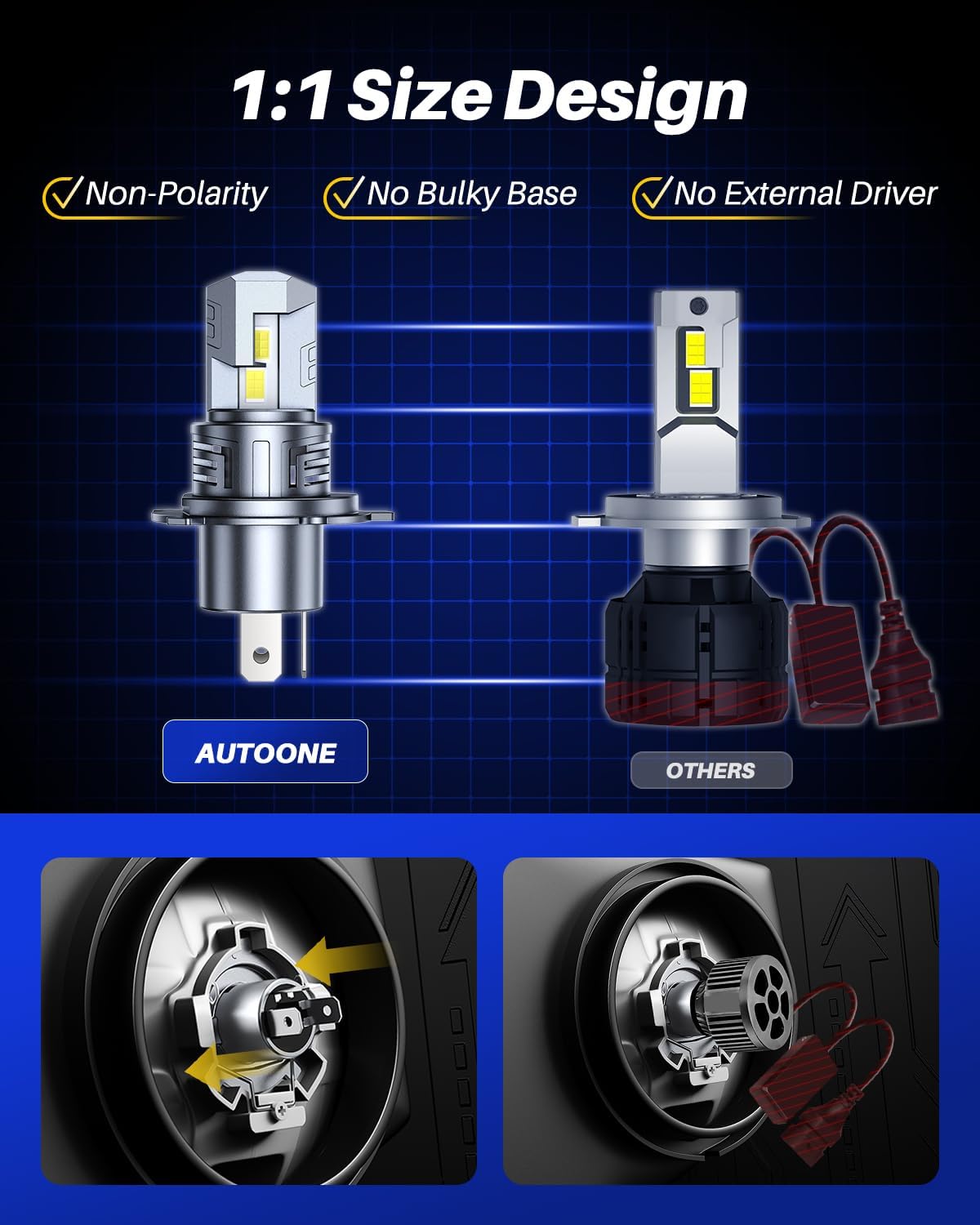 - Hassle-free Installation: AUTOONE hb2 H4 led fog bulbs feature a plug-and-play wireless and 1:1 size halogensโ design that allows people to get rid of bulky drivers and annoying wiring harnesses. No modifications on the enclosure or housing, 5 minutes easy installation