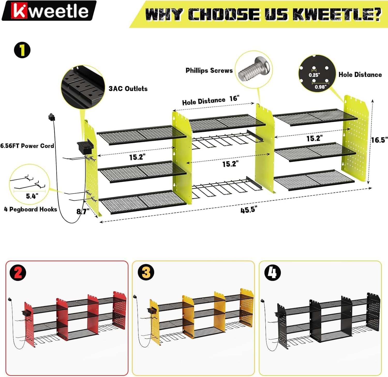 - 【HIGHLIGHT DESIGN】The user-friendly 3-plug and a plug-in row with 3 jacks are designed to be flexibly mounted on the left or right side of the shelf depending on your actual usage habits and workspace layout. Its output power of 125V/12A/1500W is like a stable and powerful energy source, which provides reliable power support for your equipment. Additionally, we've equipped you with a 6.56-FT power cord that continuously powers the tool rack