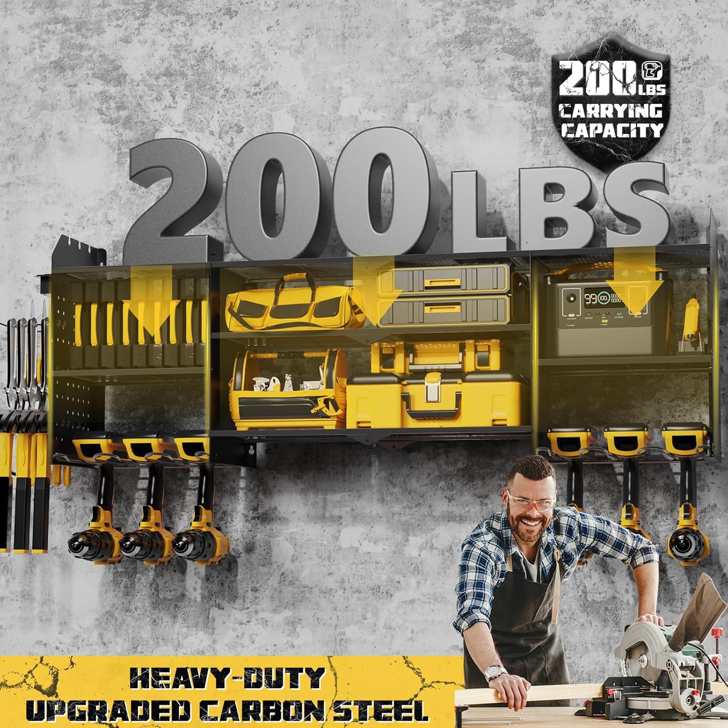 - Stable Structure with High Load Capacity: Made from heavy-duty upgraded carbon steel, this wall-mounted tool organizer is strong, stable, and resistant to deformation, supporting up to 200 lbs (40 lbs per shelf). It features easy assembly with included Phillips screws and screwdriver for a hassle-free installation
