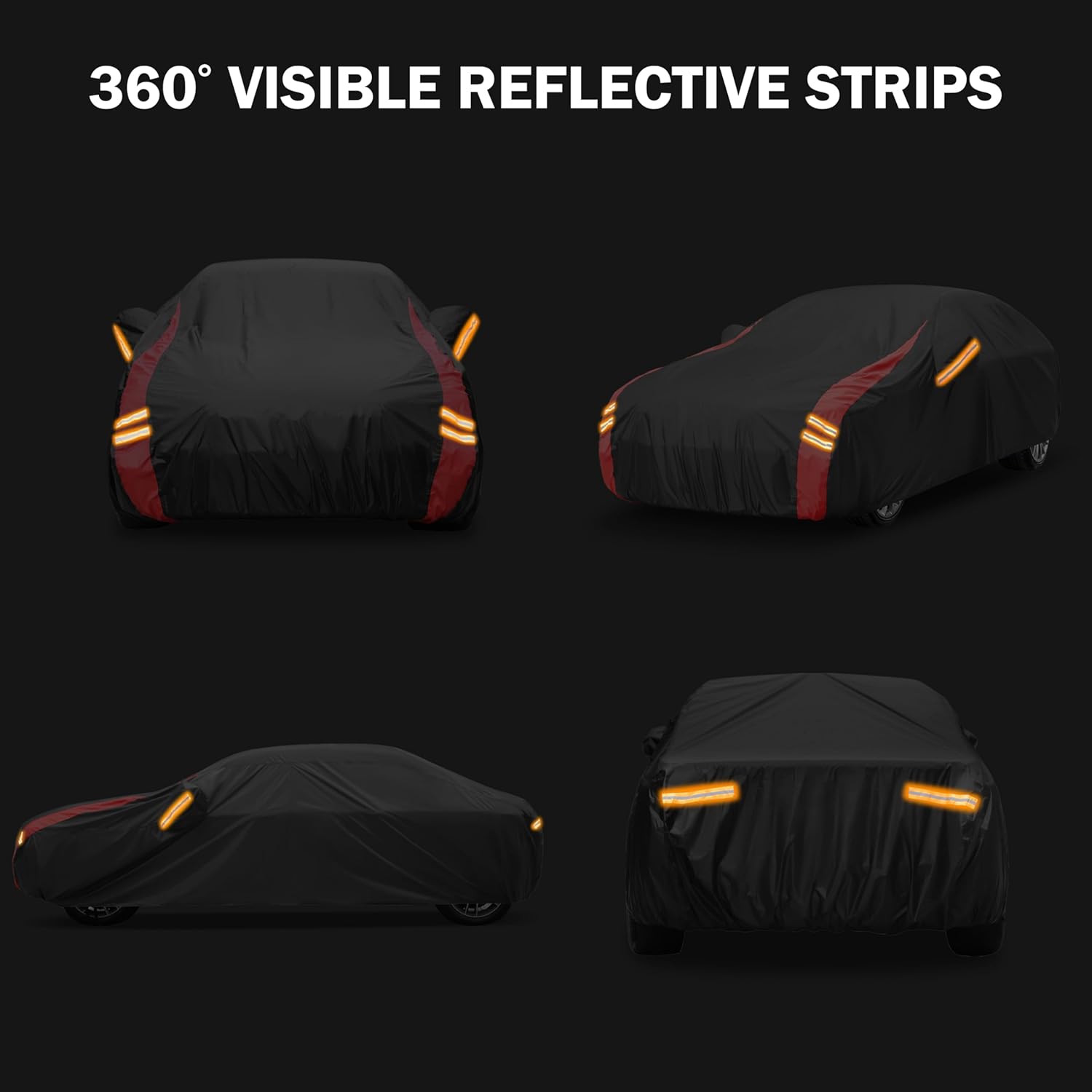 - 【Unique Design】 ① This all-weather waterproof car cover is specially designed to resist strong winds. Three specially designed windproof straps at the bottom pass through the middle of the vehicle to ensure that the cover stays in place. An additional windproof strap at the rear of the car prevents the rear cover from being lifted by the wind. ②Equipped with 4 reflective strips, these full-coverage reflective strips serve as a nighttime reminder to others, ensuring parking safety. perfectly protect your side mirrors and prevent damage.