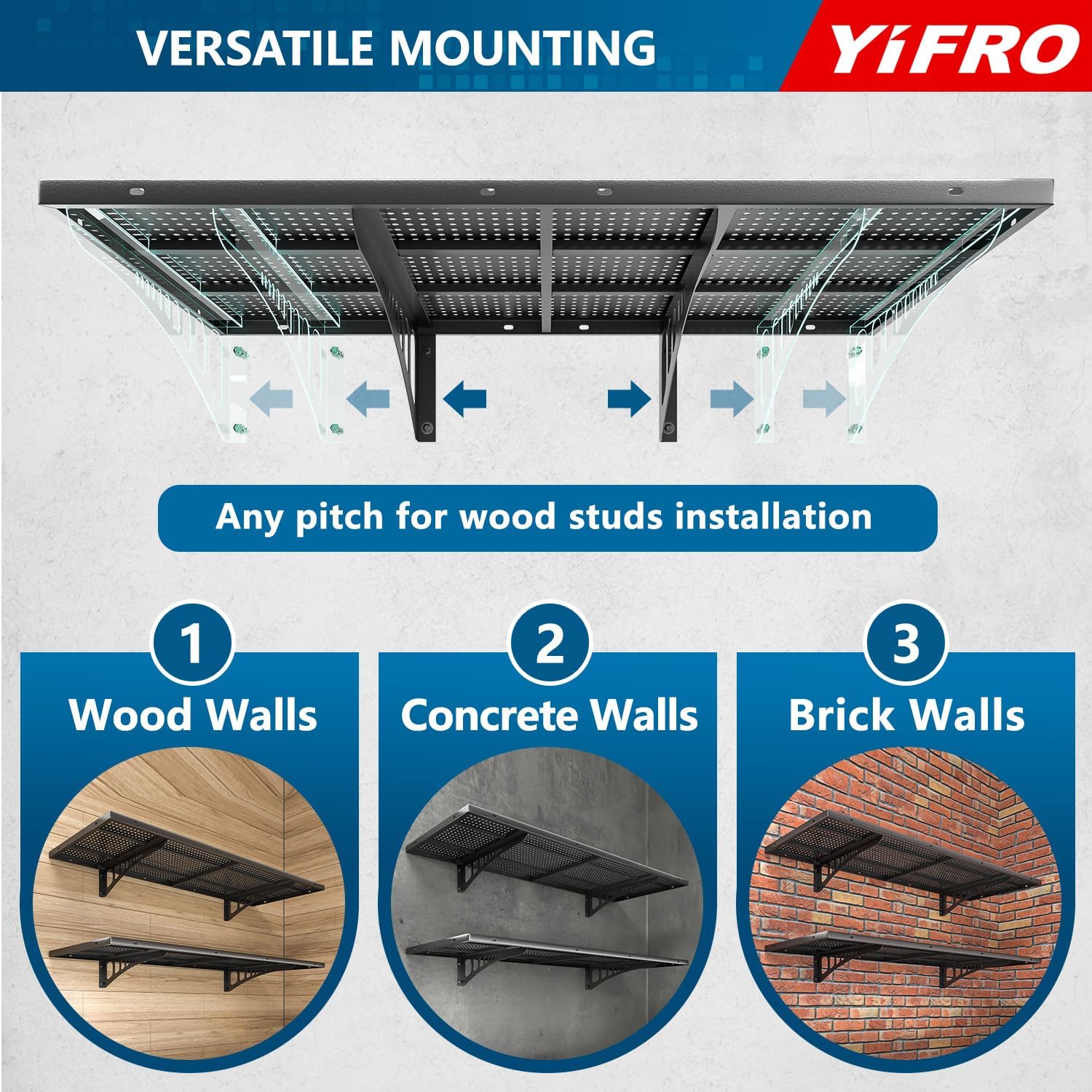 - ADJUSTABLE SPACING: YIFRO garage wall shelves is suitable for any wood post spacing, including standard 16'/18'/24'/32' spacing for installation.