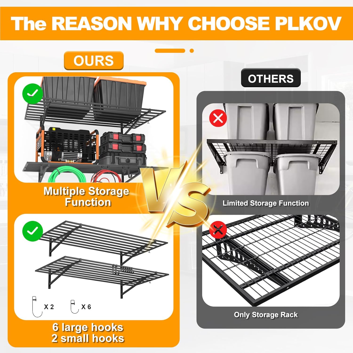 - 【Thoughtful Hook Design】Equipped with (2) large hooks and (6) small hooks for hanging storage underneath the shelf, perfect for items such as bicycles, ropes, extension cords and more. This design further expands the storage function, allowing you to make full use of the space under the storage shelves , making the storage more flexible and diverse, and bringing more convenience to your life.