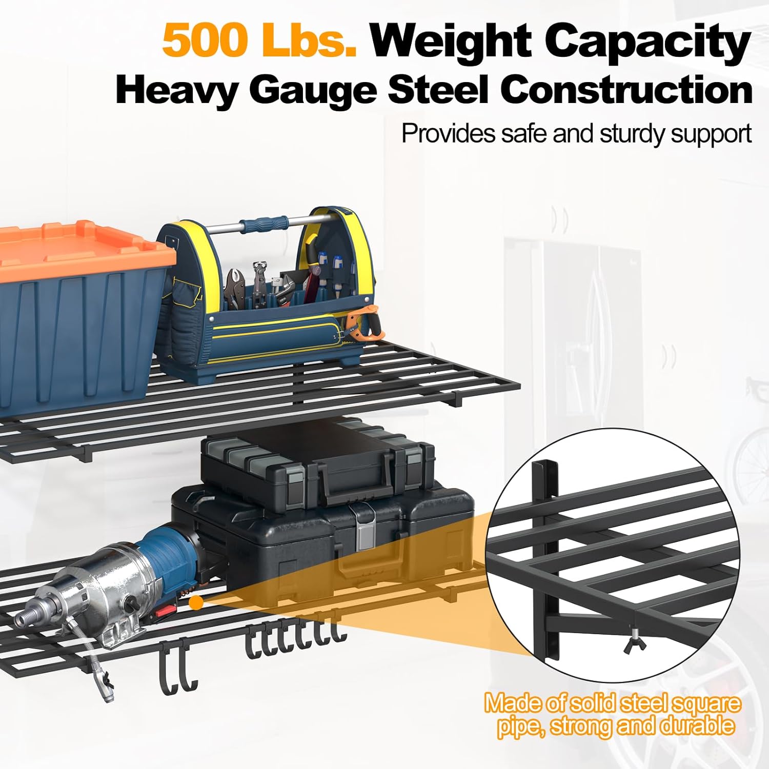 - 【Strong and durable】Garage storage shelves made of heavy-duty steel, the shelves for wall storage and wall brackets are constructed of solid steel square tubing and can hold a total of up to 500 pounds. Solid materials and solid construction ensure that they remain in good condition even when carrying heavy loads for a long time, providing solid and reliable support for your items.